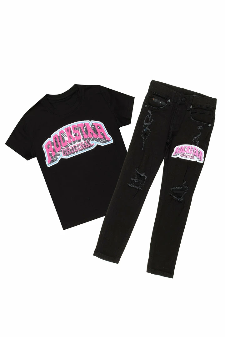 Rockstar Original Boy’s two-piece denim set. Featuring embroidered RSO logos on the top and bottoms. Top accents a crew neckline with a relaxed fit while bottoms accent a front button closure with a high quality coin pocket and distressed details throughout.