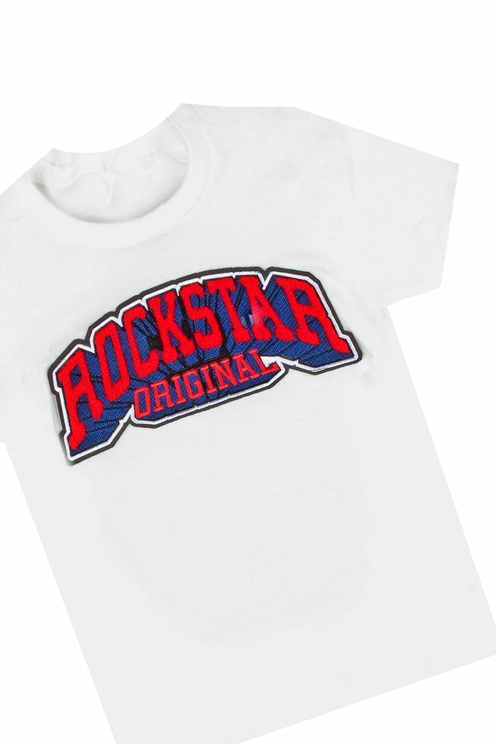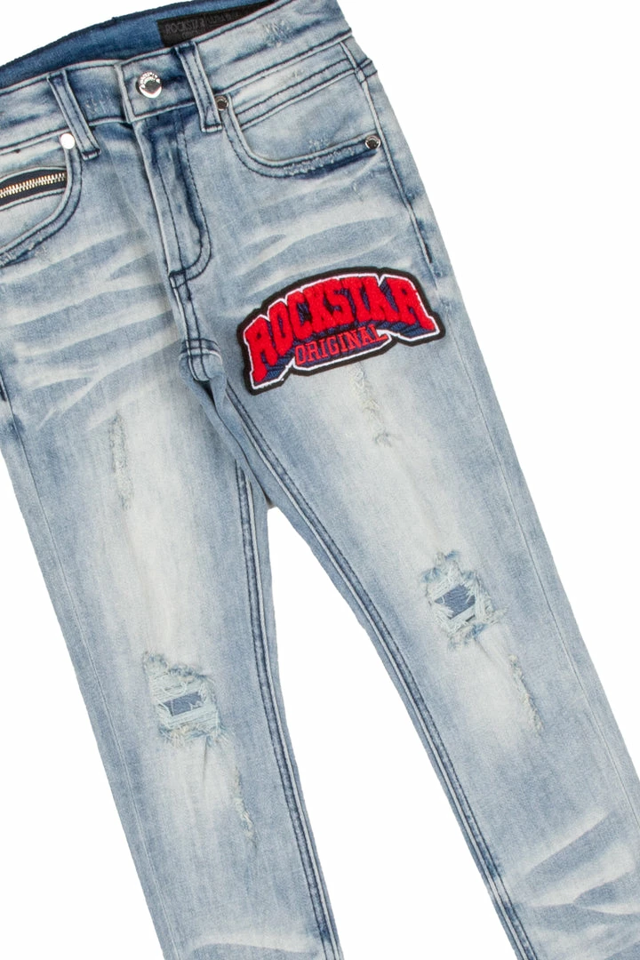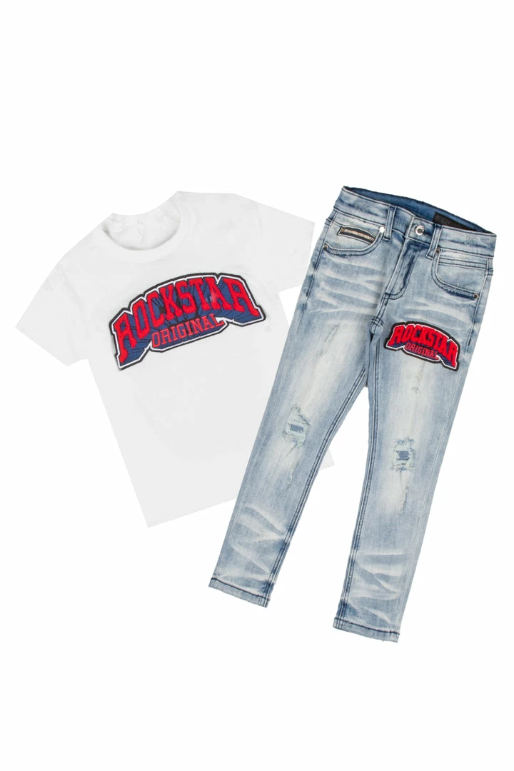 Rockstar Original Boy’s two-piece denim set. Featuring embroidered RSO logos on the top and bottoms. Top accents a crew neckline with a relaxed fit while bottoms accent a front button closure with a high quality coin pocket and distressed details throughout.