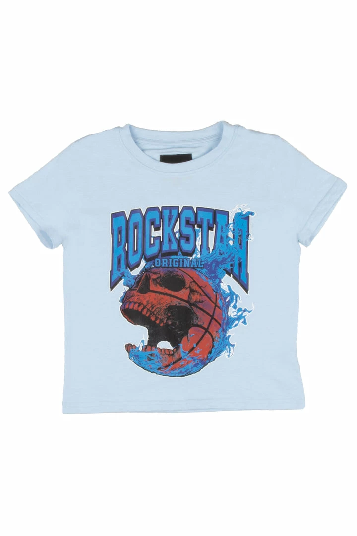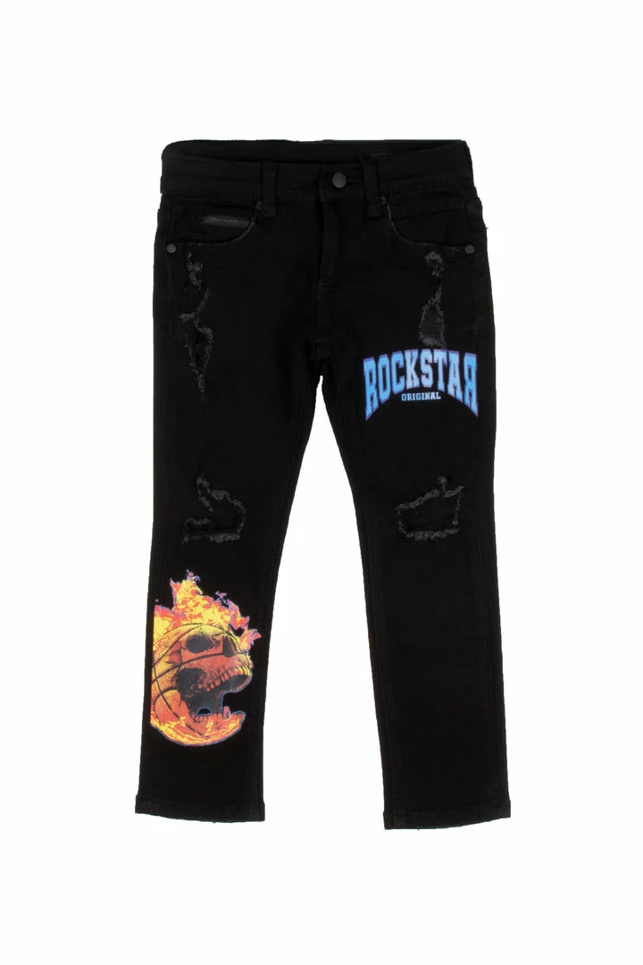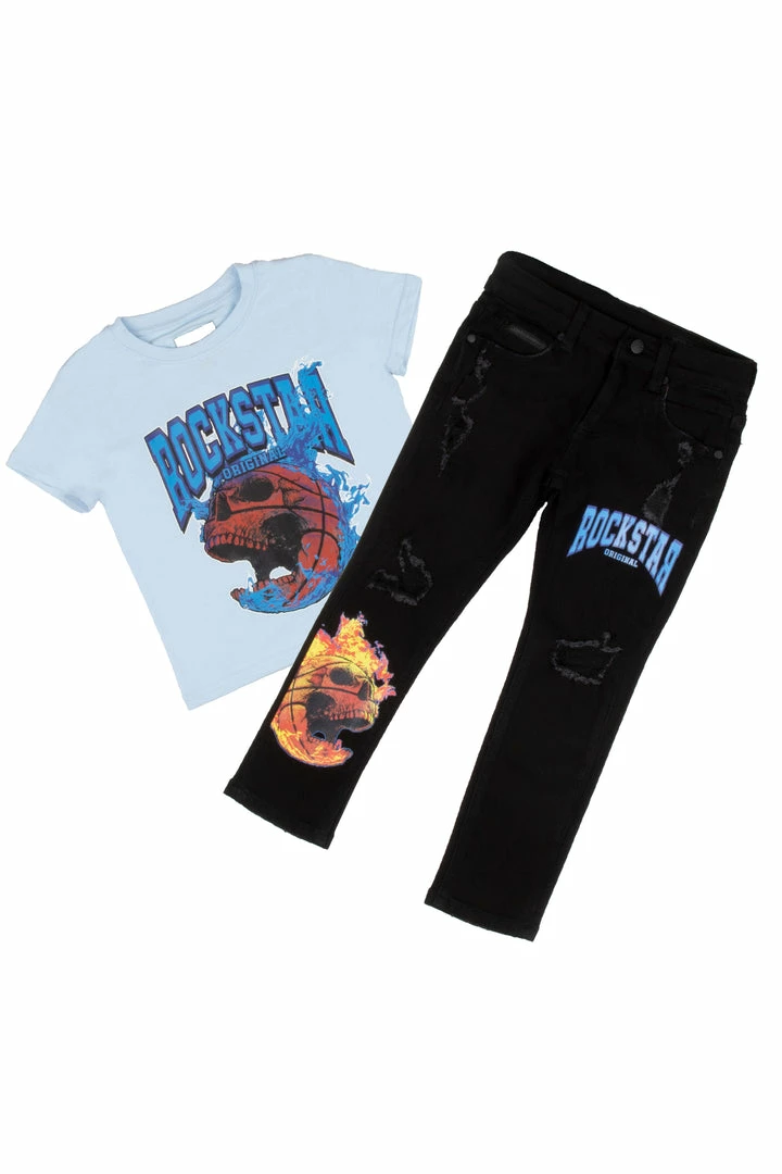 Rockstar Original Boy’s two-piece denim set. Featuringย printedย RSO logos with multi color skull graphics on the top and bottoms. Top accents a crew neckline with a relaxed fit while bottoms accent a front button closure with a high quality coin pocket and distressed details throughout.