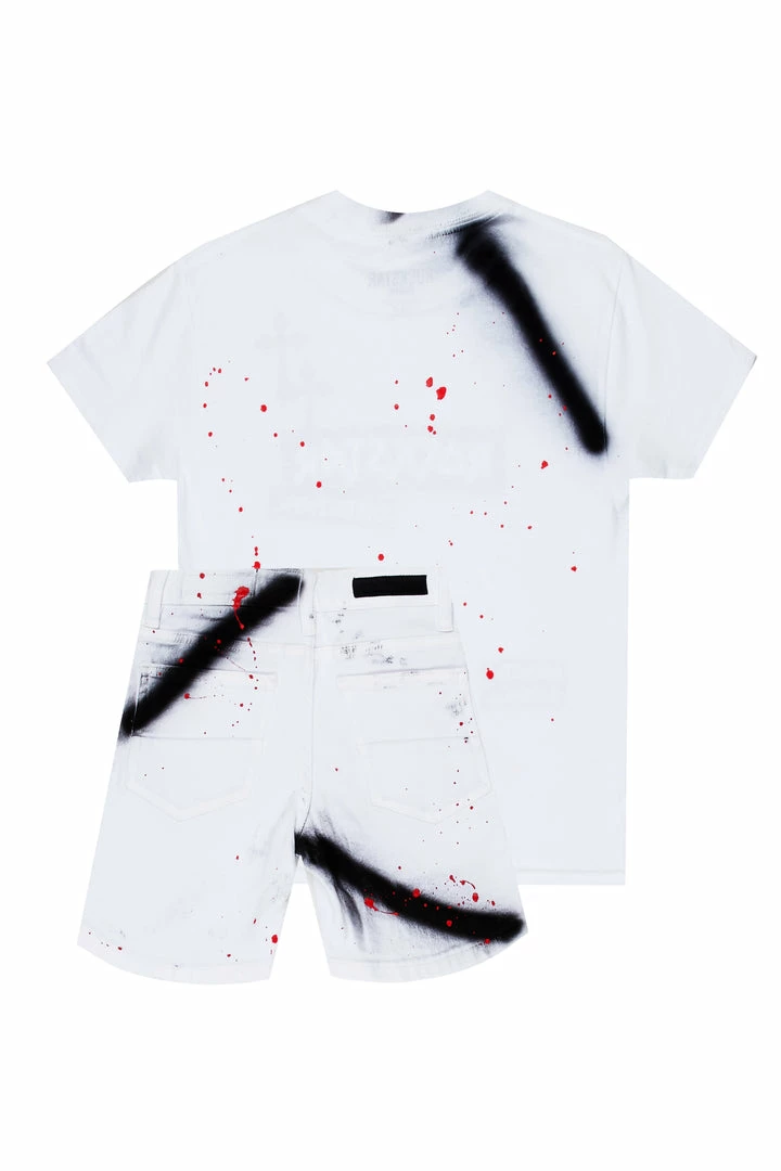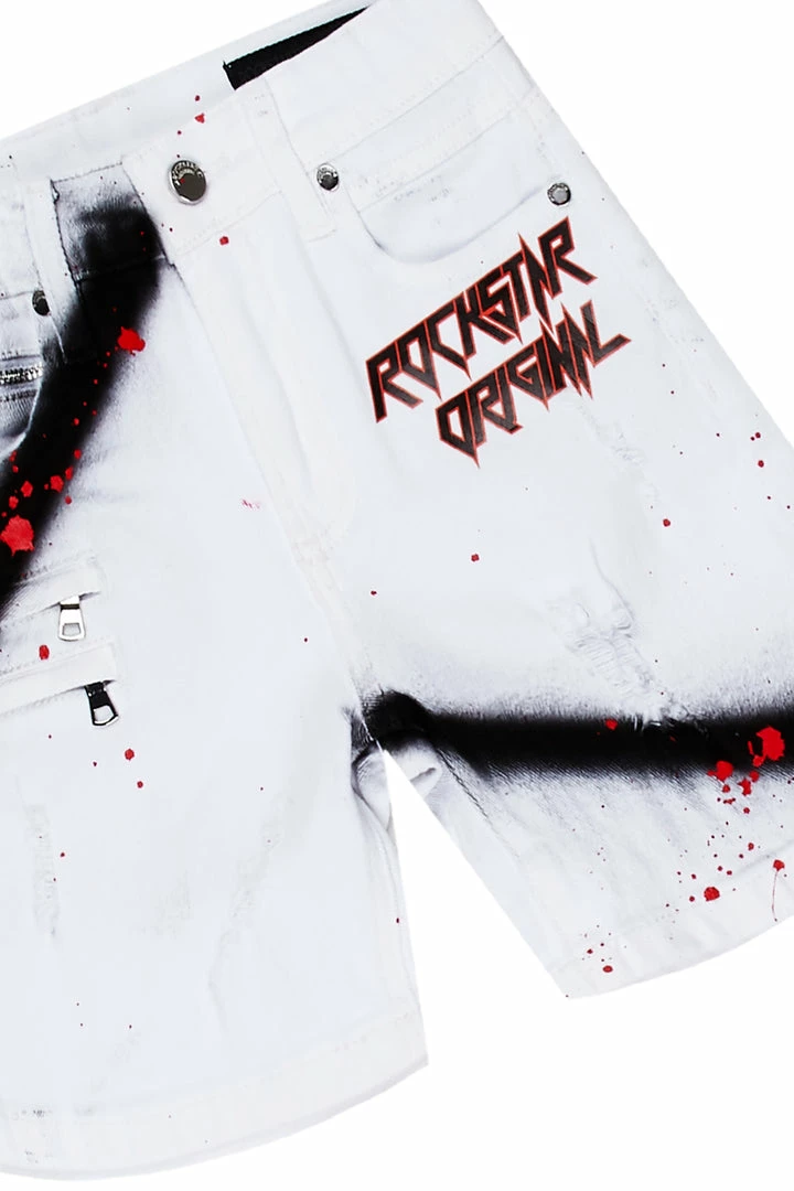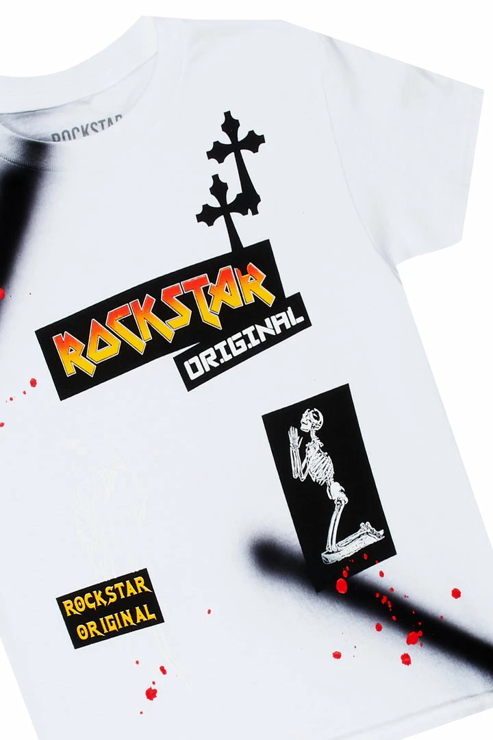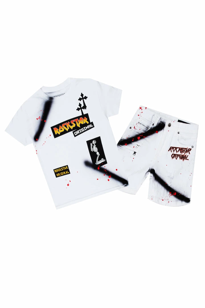 Rockstar Original Boy’s two-piece short set in white. Featuring printed RSO logos on the top and bottoms with skull and cross graphics on the top and custom ombre detailing on the shorts.Β Tee is designed with a crew neckline and relaxed fit while bottoms accent distressed detailing, an elastic waistband, high quality zipper coin pockets and easy slide clasp closure. Your Mini will look good and feel better all day long!