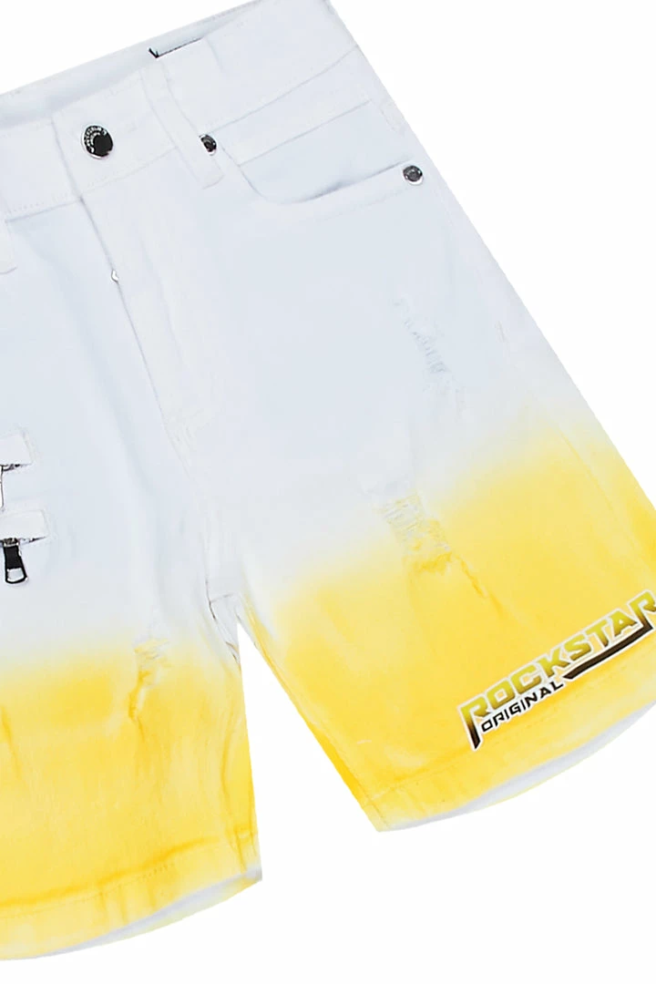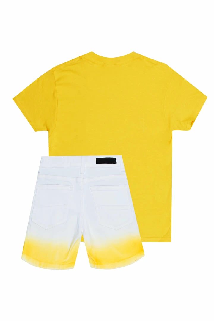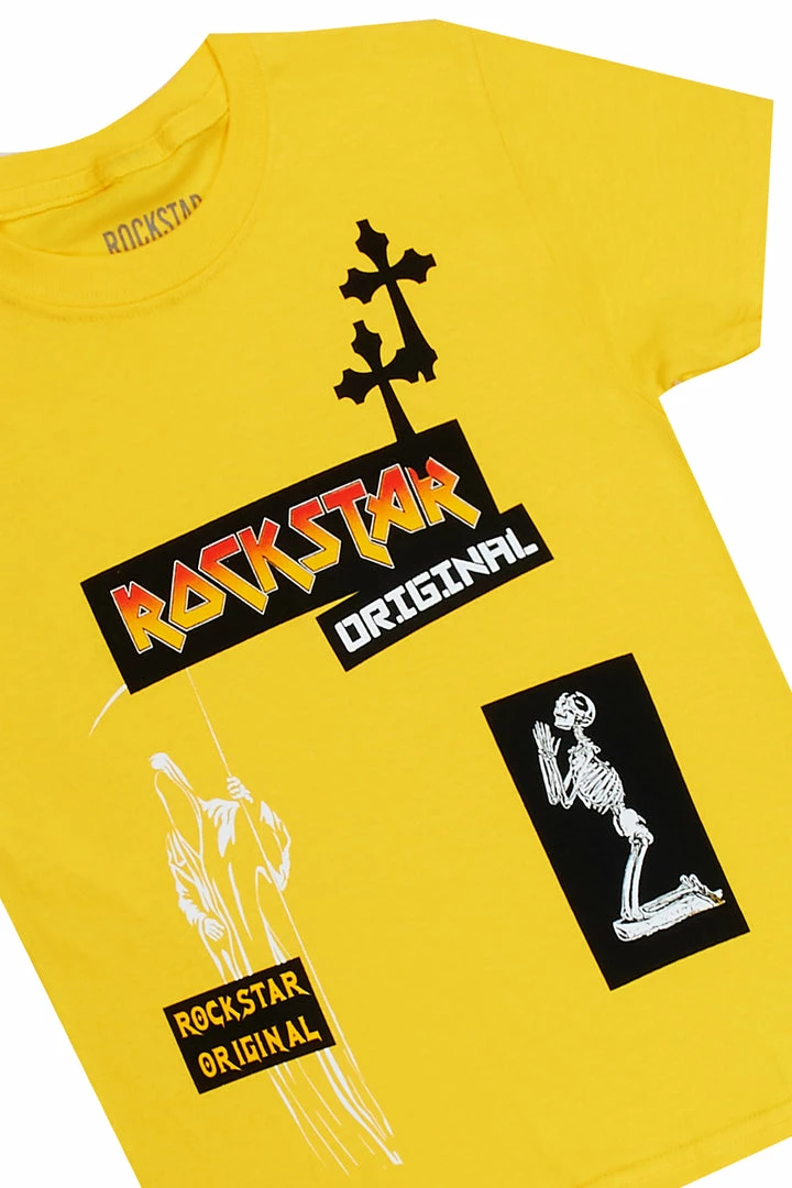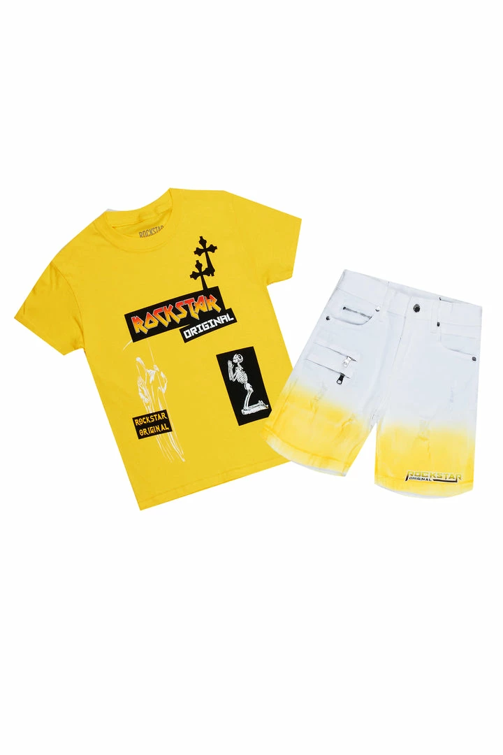 Rockstar Original Boy’s two-piece short set in yellow. Featuring printed RSO logos on the top and bottoms with skull and cross graphics on the top and custom ombre detailing on the shorts.ย Tee is designed with a crew neckline and relaxed fit while bottoms accent distressed detailing, an elastic waistband, high quality zipper coin pockets and easy slide clasp closure. Your Mini will look good and feel better all day long!