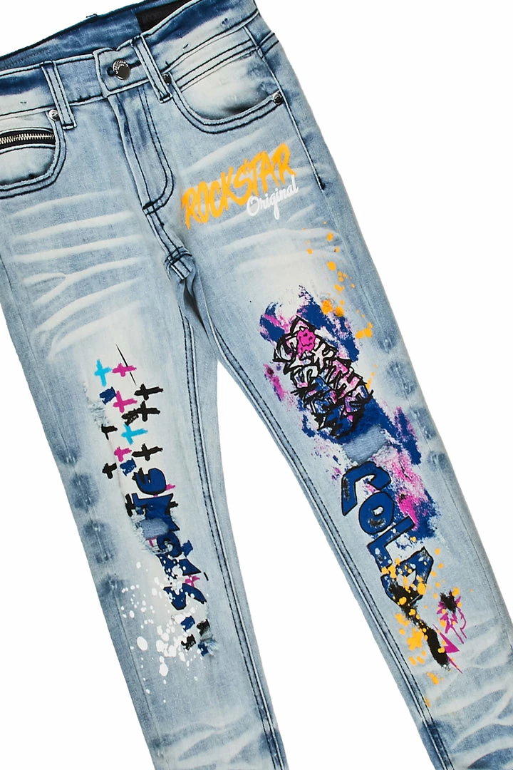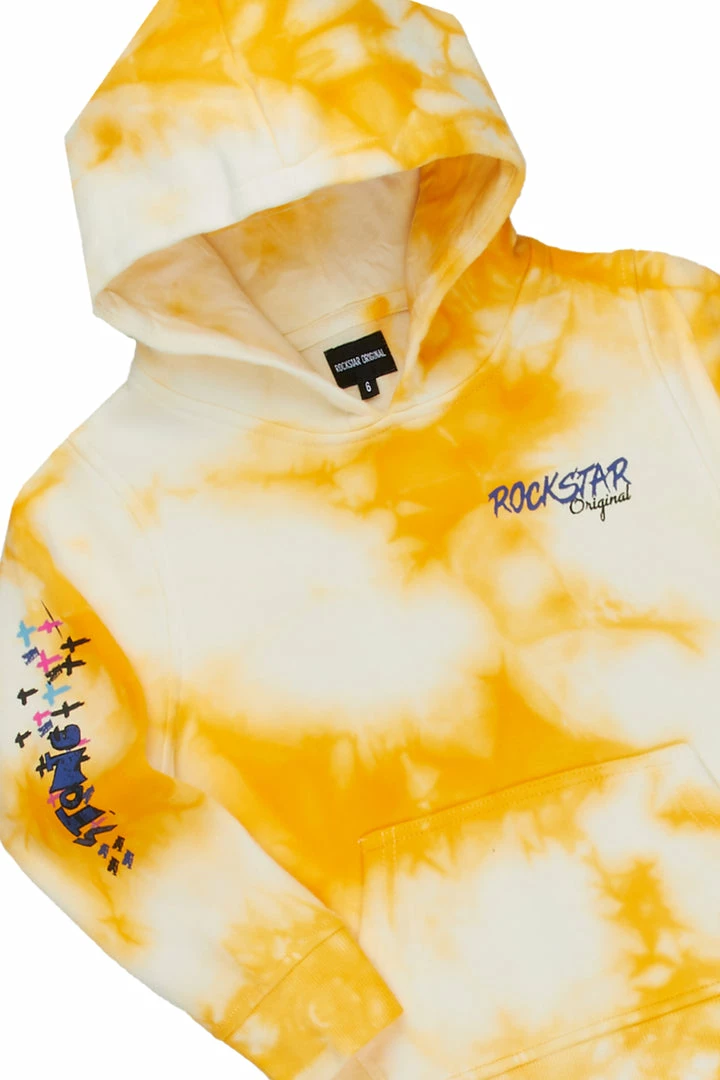 Rockstar Original Kid’s denim set inย light washย andย yellow. Featuring printed RSO logos with graphicsย throughout and custom paintย detailingย on the bottoms. Thisย fire ‘fitย is designed withย fitted hemsย on the hoodieย while bottoms accentย distressed detailing, an elastic waistband, a high quality zipper coin pocket and easyย buttonย closure. Your Mini will look good and feel better all day long!