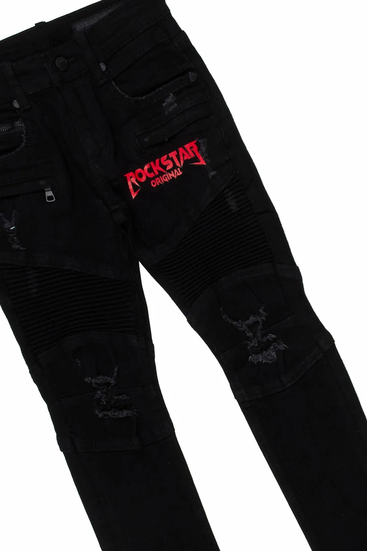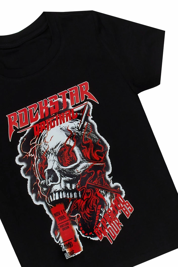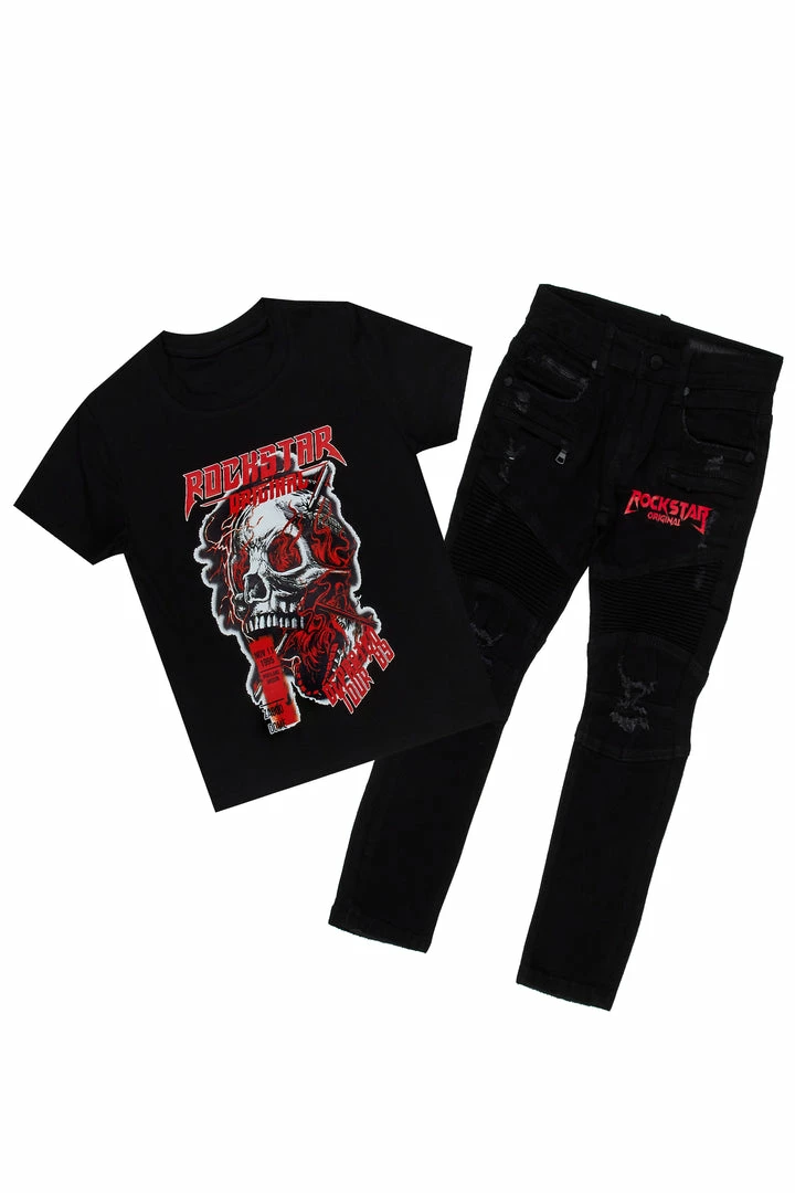 Rockstar Original Kid’s denim set in black. Featuring printed RSO logos with skull graphics to match on the top and bottoms. Top accents a crew neckline with a relaxed fit while bottoms accent distressed detailing, a high quality zipper coin pocket and slide clasp closure. Your ‘Lil Rockstar will look good and feel better all day long!