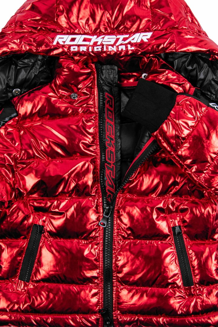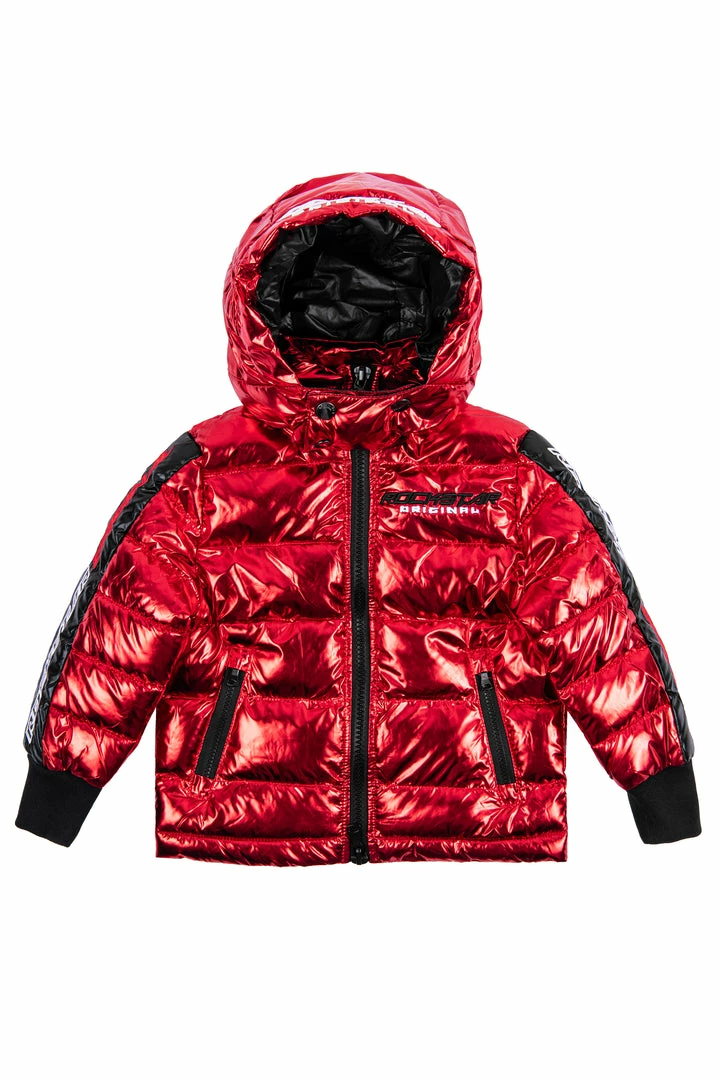 Rockstar Original Boy’s puffer jacket featuring a RSO logo on front, back and sleeves. Metallic fabric all throughout. Bubble coat accents removable button hoodie, made with down alternative. High quality zipper and pockets.