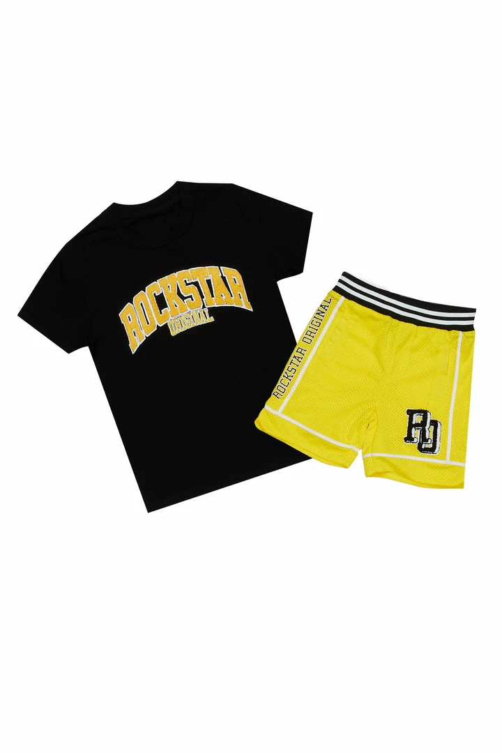 Rockstar Original Boy’s two-piece short set in black.ย Featuring embroidered RSO logos on the top and bottoms. Top accents a crewneck line, lightweight wear and premium cotton threading while bottoms accent a ribbed drawstring waistband with a racer stripe design, breathable mesh fabric and side pockets for style and convenience.