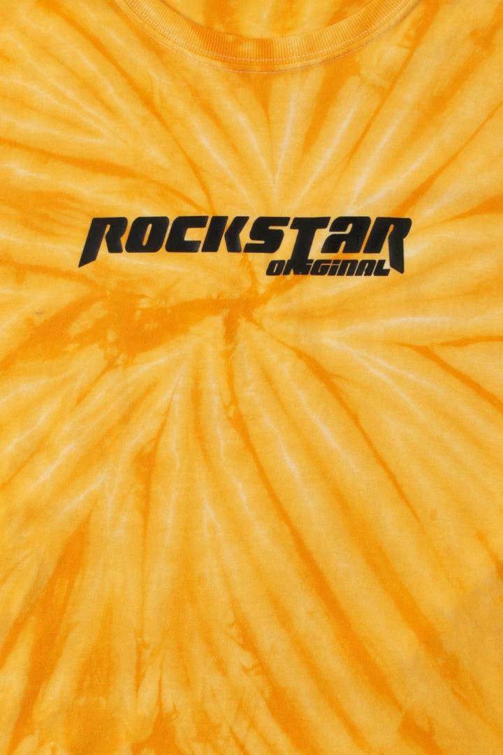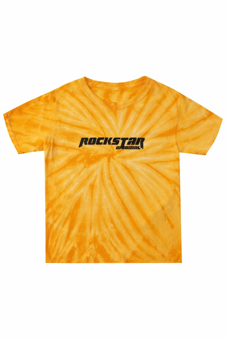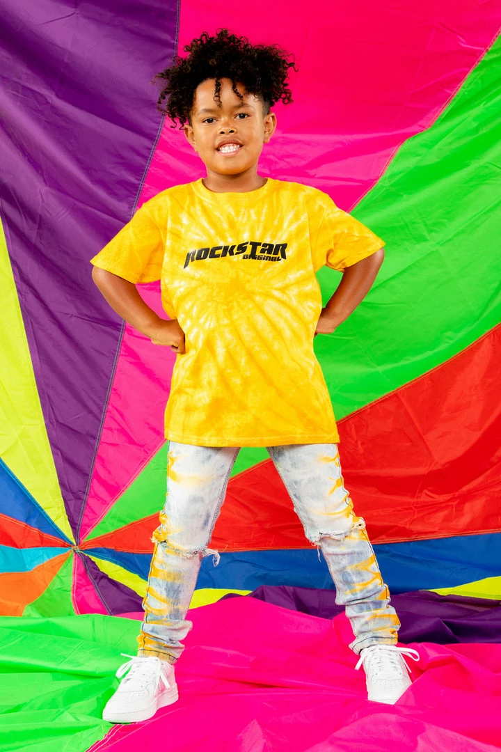 Rockstar Original Kid’s tee in tie-dye yellow. Featuring a printed RSO logo with a crew neckline and relaxed fit. Designed with premium cotton threading for a comfortable wear.