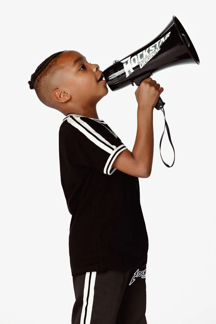 Rockstar Original Boy’s two-piece track set in black. Featuring rhinestone RSO logos with embroidered stripe detailing on the top and bottoms. Top accents a crew neckline with a relaxed fit while pants accent a drawstring waistband with high-quality zipper pockets and ankle zipper inseams.