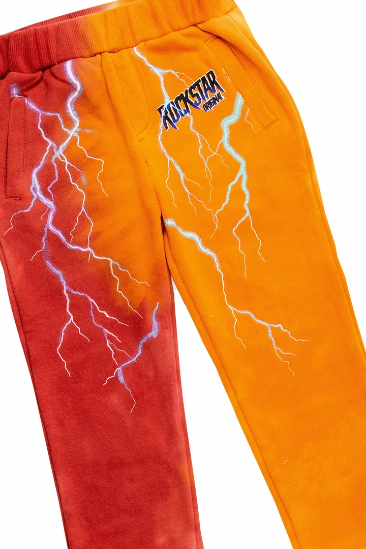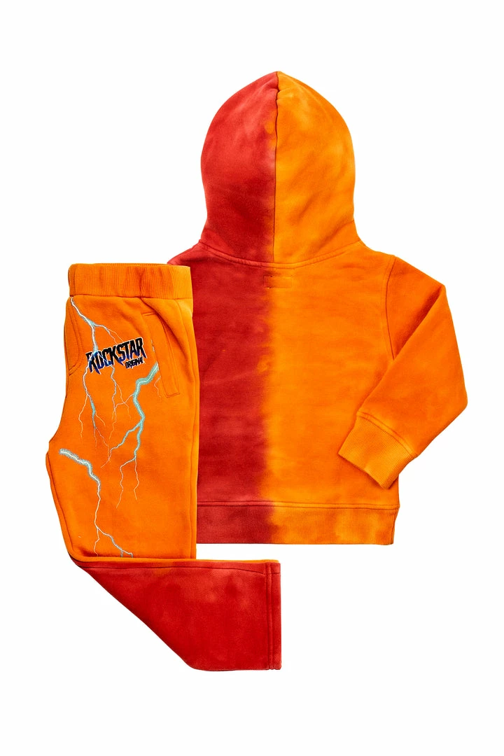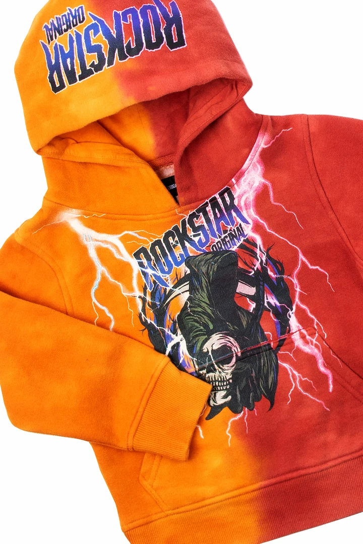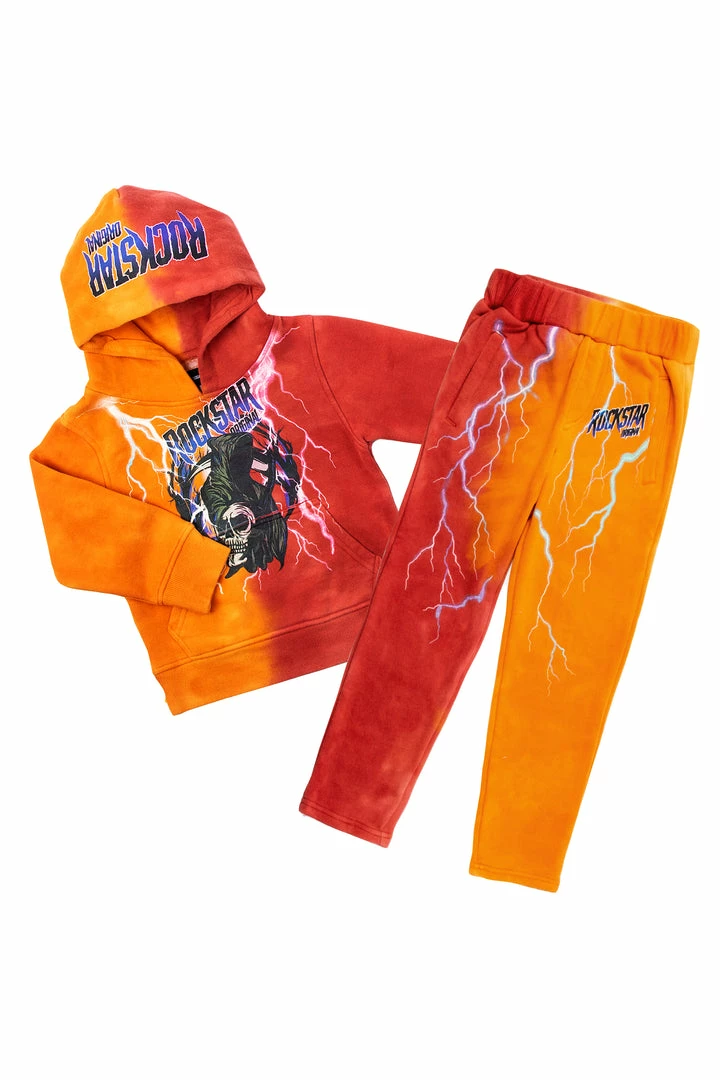 Rockstar Original Kid‘s two-piece tracksuitย set. Featuring RSO logos with graphic prints against a splitย tie dye wash design. This must-have accents a front pocketย on the top while the bottoms accent a relaxed fit, elastic waistband, side pocketsย and premium cotton threading to keep your Mini Me forย cool, comfortable and casual.