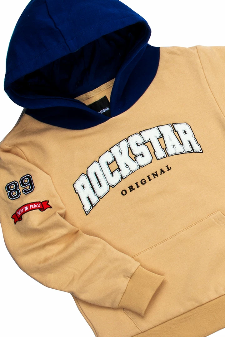 Rockstar Original Kid‘s two-piece hoodie tracksuit set in beige. Featuring embroidered RSO logos with embroidered patches against a duo color design. This must-have set accents a front pocket on the top while the bottoms accent a elastic waistband, side pockets, cuffed hems and premium cotton threading to keep your Mini Me for cool, comfortable and casual.