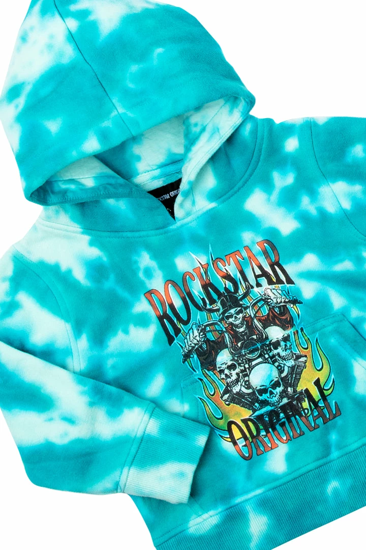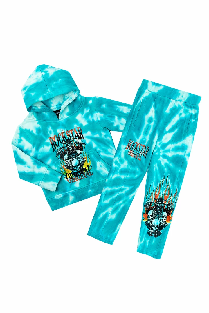 Rockstar Original Kid‘s two-piece hoodie set. Featuring RSO logos with graphic prints against a tie dye wash design. This must-have accents a front pocketย on the top while the bottoms accent a relaxed fit, elastic waistband, side pocketsย and premium cotton threading to keep your Mini Me forย cool, comfortable and casual.