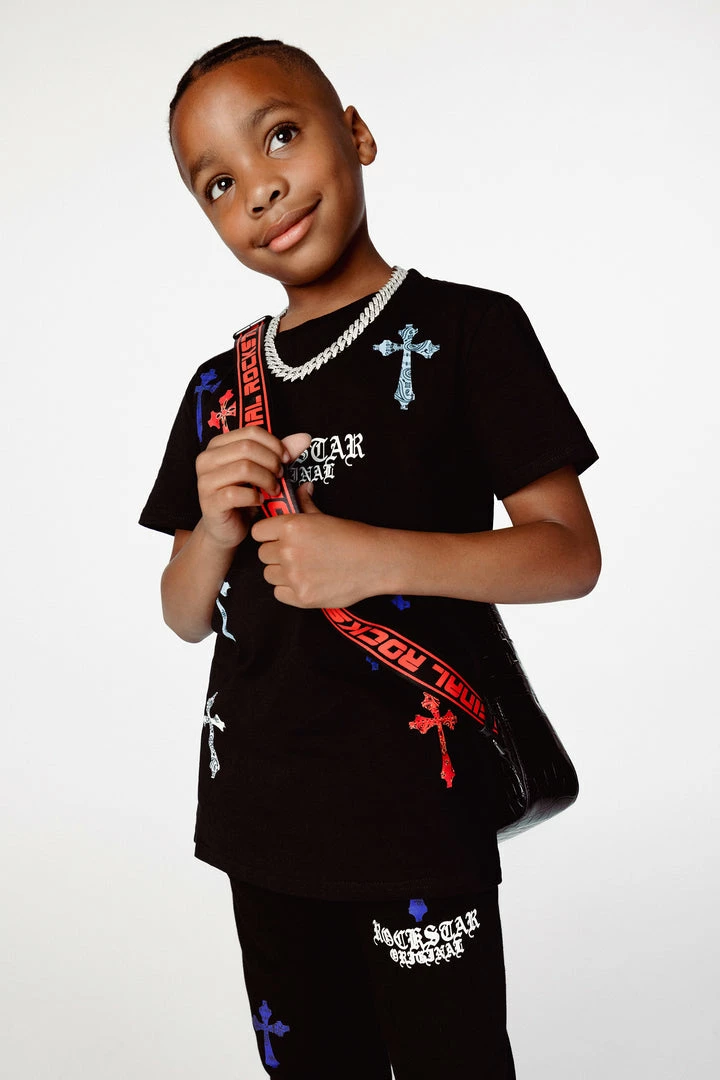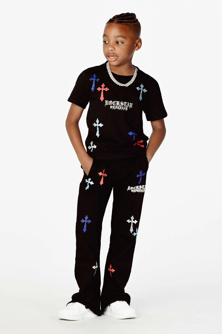 Rockstar Original Kid’sย track set in black. Featuring printed RSO logos with paisley crossย graphics to match on the top and bottoms.ย Top accents a crew neckline with a relaxed fit while bottoms accentย a drawstring waistband with high quality zipper pockets and flare hems.