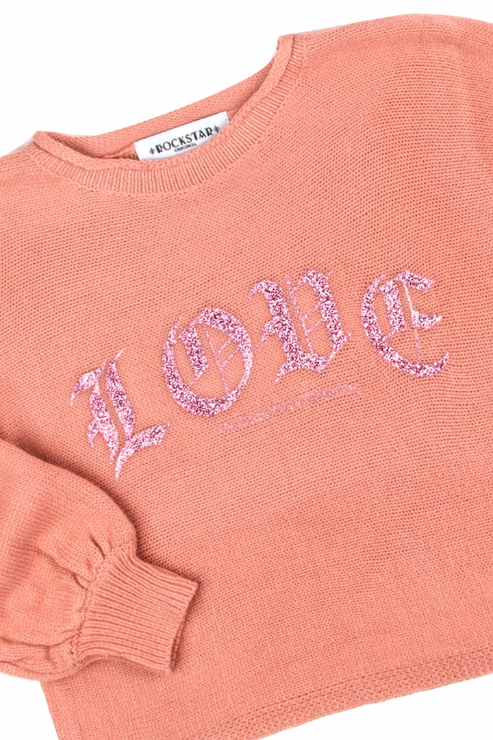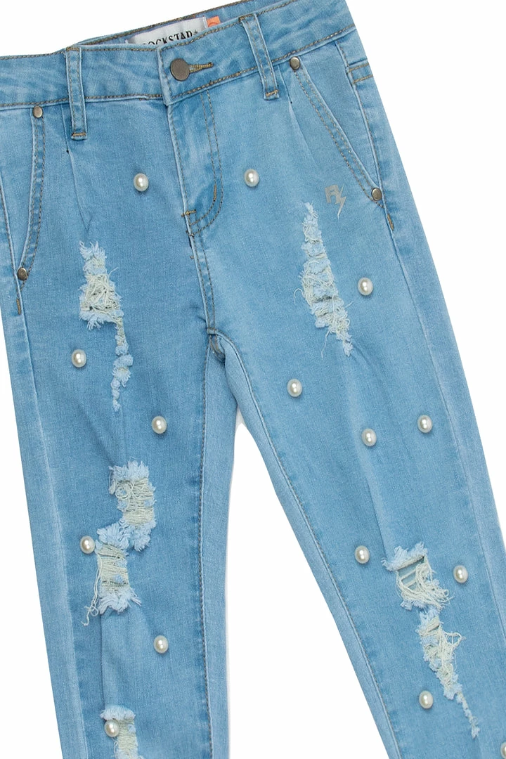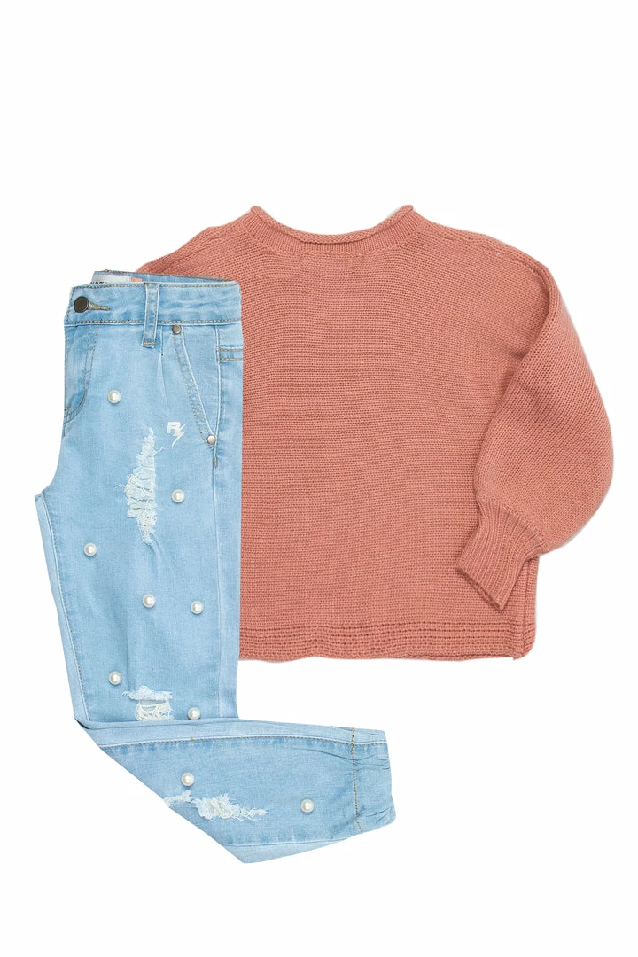 Rockstar Original Girl’s denim jean and sweater set in apricot. Sweater features a soft knit design with cuffed sleeves and printed crystal RSO logo. Jeans accent a jogger silhouette with elastic cuffs and elastic waistband with distressed detailing and embroidered pearls for that added touch of simple and sweet. This two-piece set will have your Mini Me steal the show!