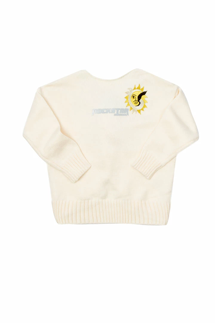 Rockstar Original Girl’s sweater in ivory. Featuring a soft knit design with posterior pattern and printed RSO logo with an embroidered graphic. This gorgeous sweater will have your Mini Me steal the show!