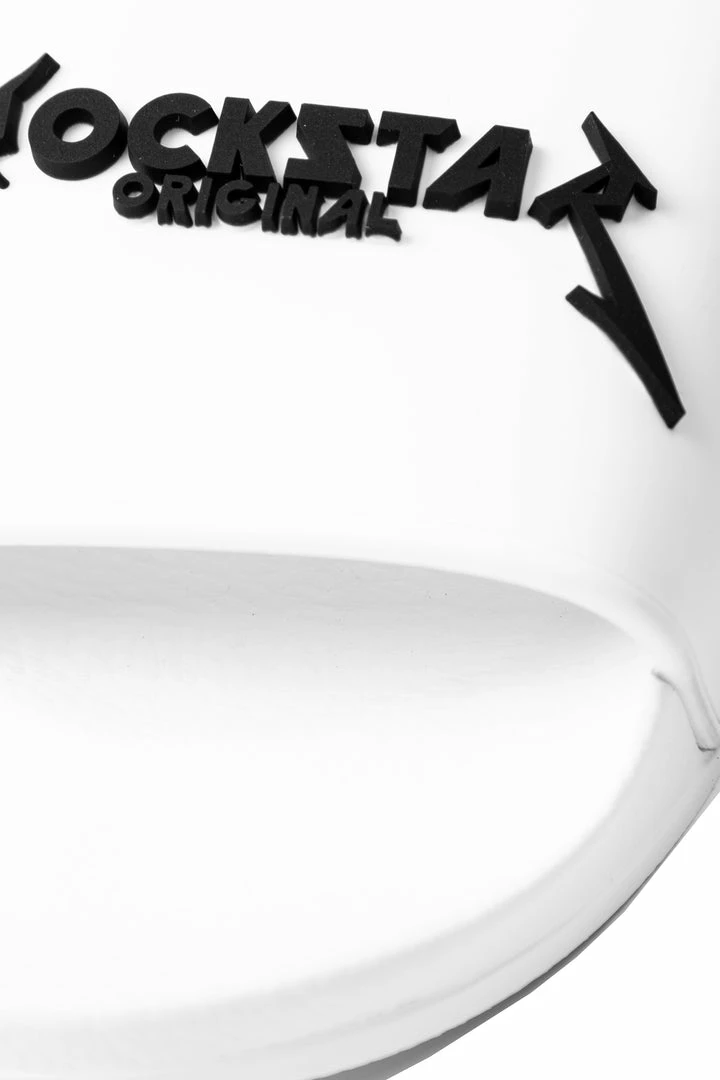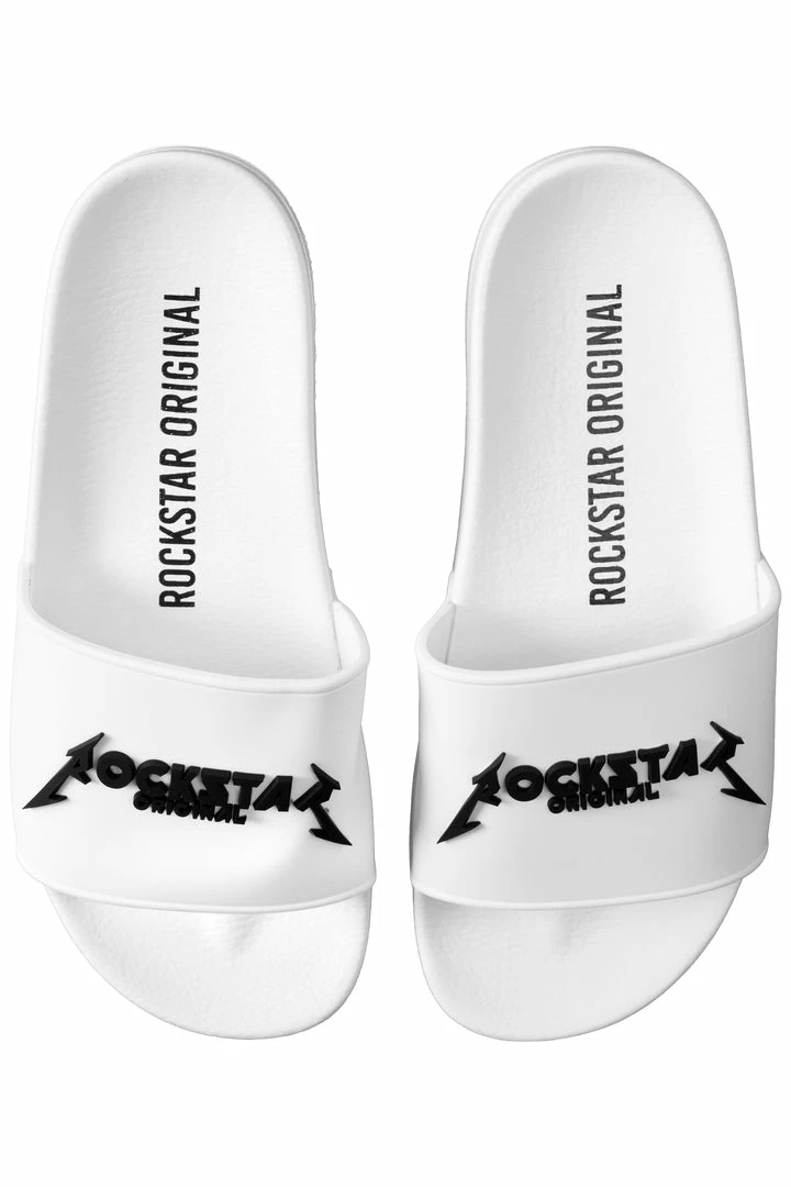 Rockstar Original unisex slides in white. Featuring a RSO logo with two pinstripe details. Accenting comfortable synthetic upper and outsole for all day wear.