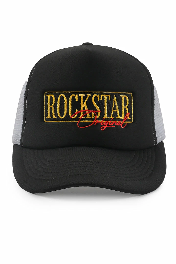Rockstar Original Men’s trucker hat in black. Featuring an embroidered RSO logo with mesh fabric backing.