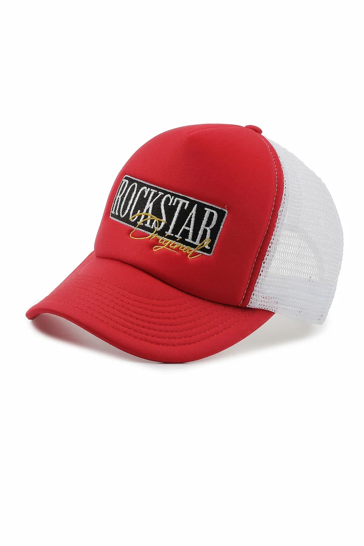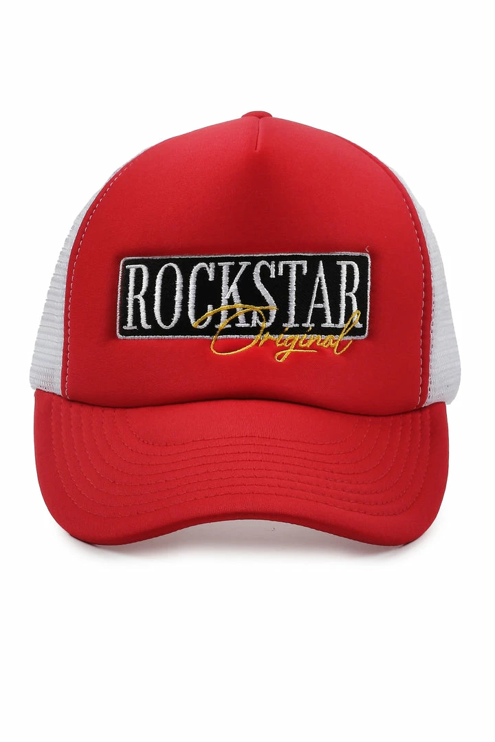 Rockstar Original Men’s trucker hat in red. Featuring an embroidered RSO logo with mesh fabric backing.
