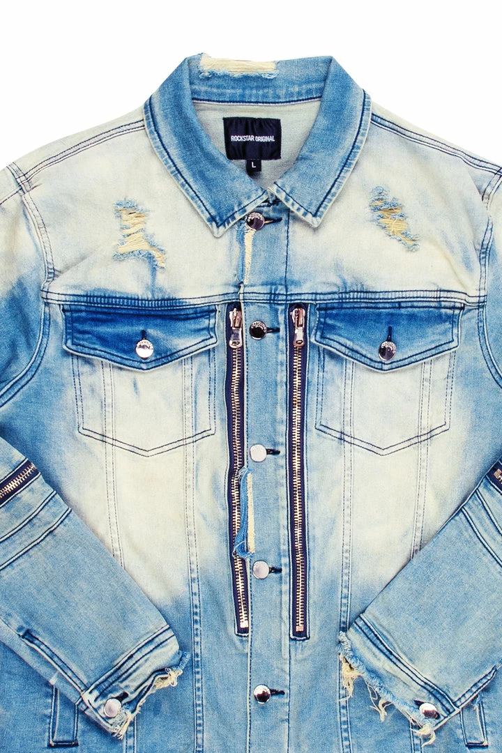 Rockstar Original Men’s denim jacket in medium wash. Featuring a collared neckline, high quality zipper accents with a front button closure, side pockets, two chest button pockets and buttoned cuffs. This signature moto biker jacket is designed with premium cotton threading for comfort and durability.