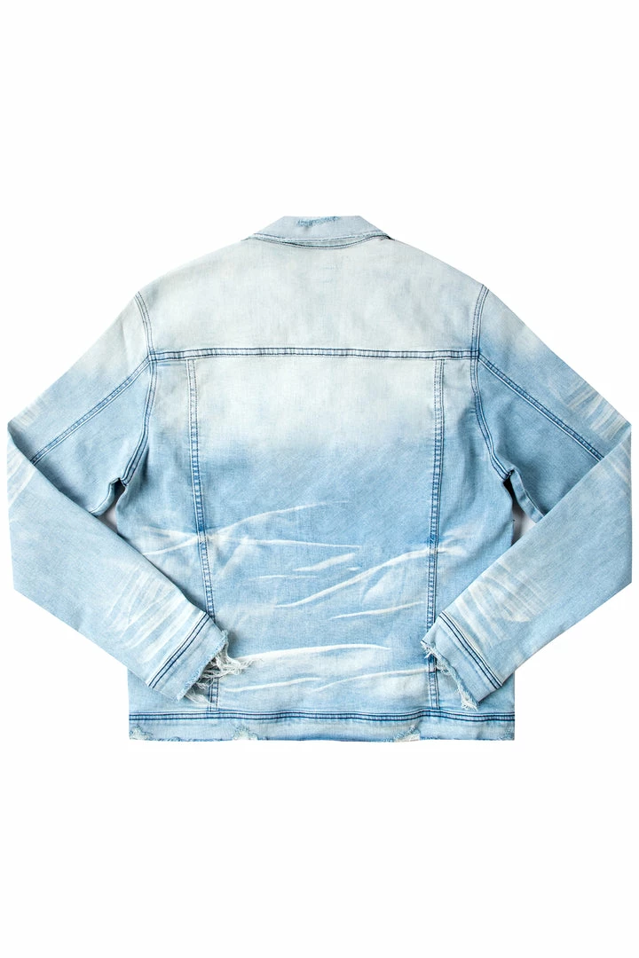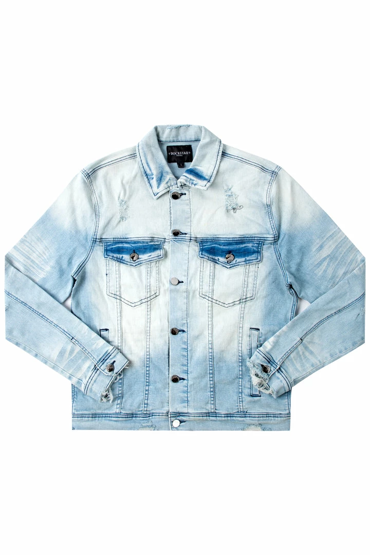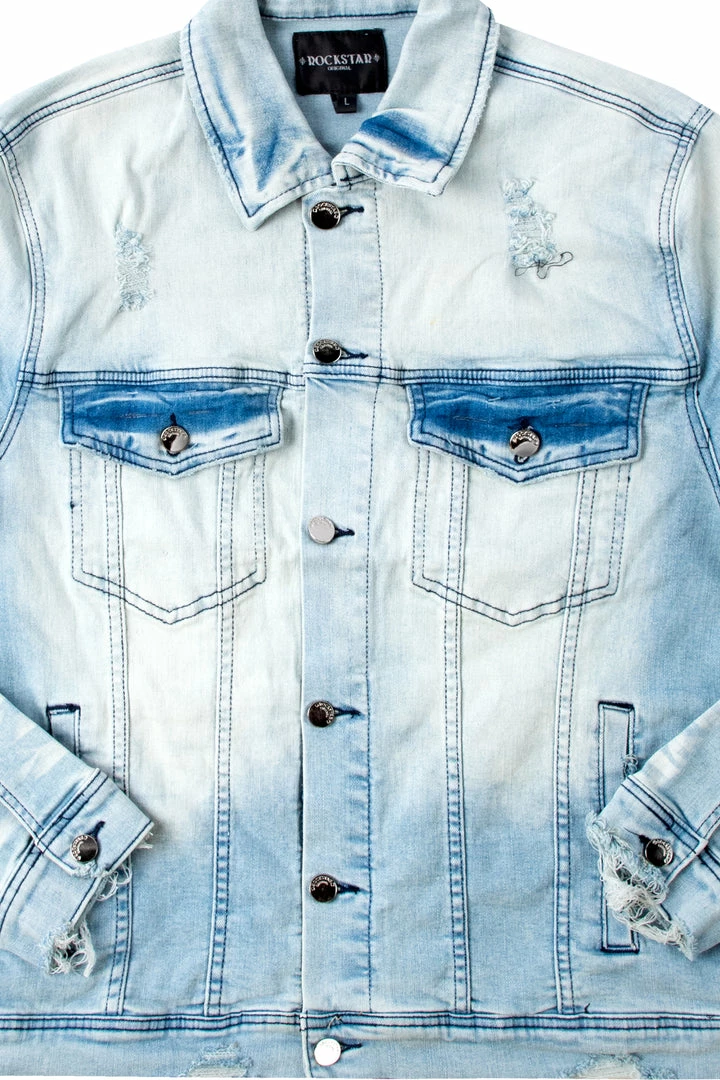 Rockstar Original men’s jacket featuring a light wash with distressed details all throughout. High quality button down closure with two front pockets.