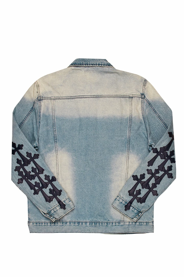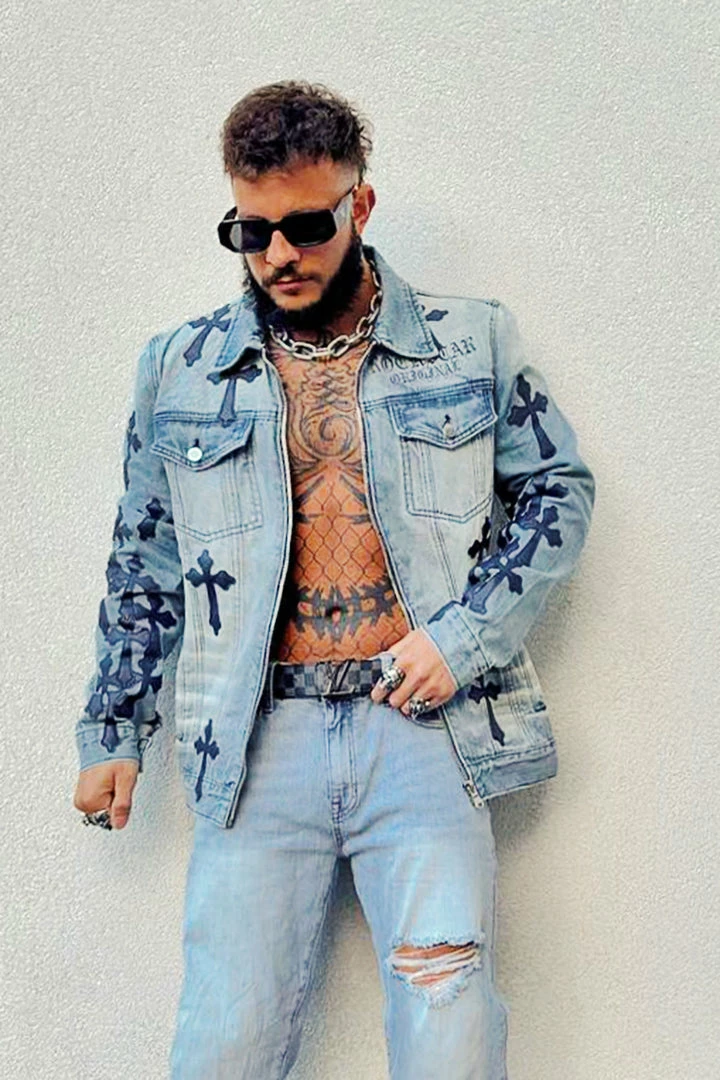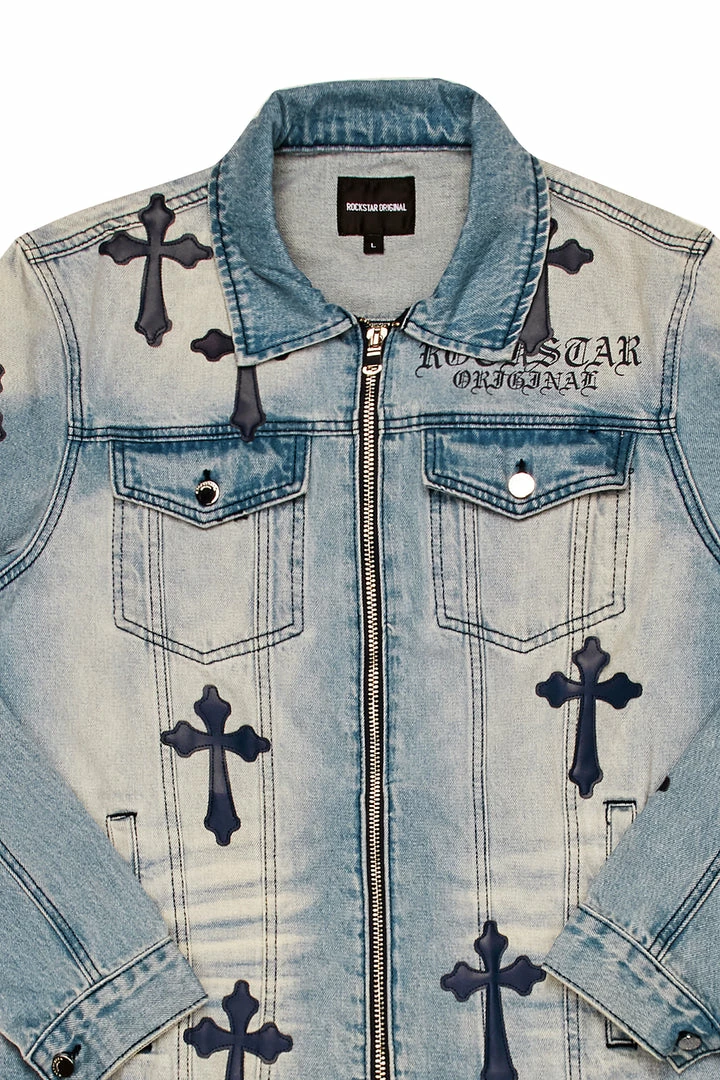 Rockstar Original Men’s denim jacket in light wash. Featuring a printed RSO logo with embroidered cross graphics throughout. This must-cop denim jacket accents a collared neckline with a high quality front zipper closure, dual chest pockets and premium cotton threading for all day comfort.
