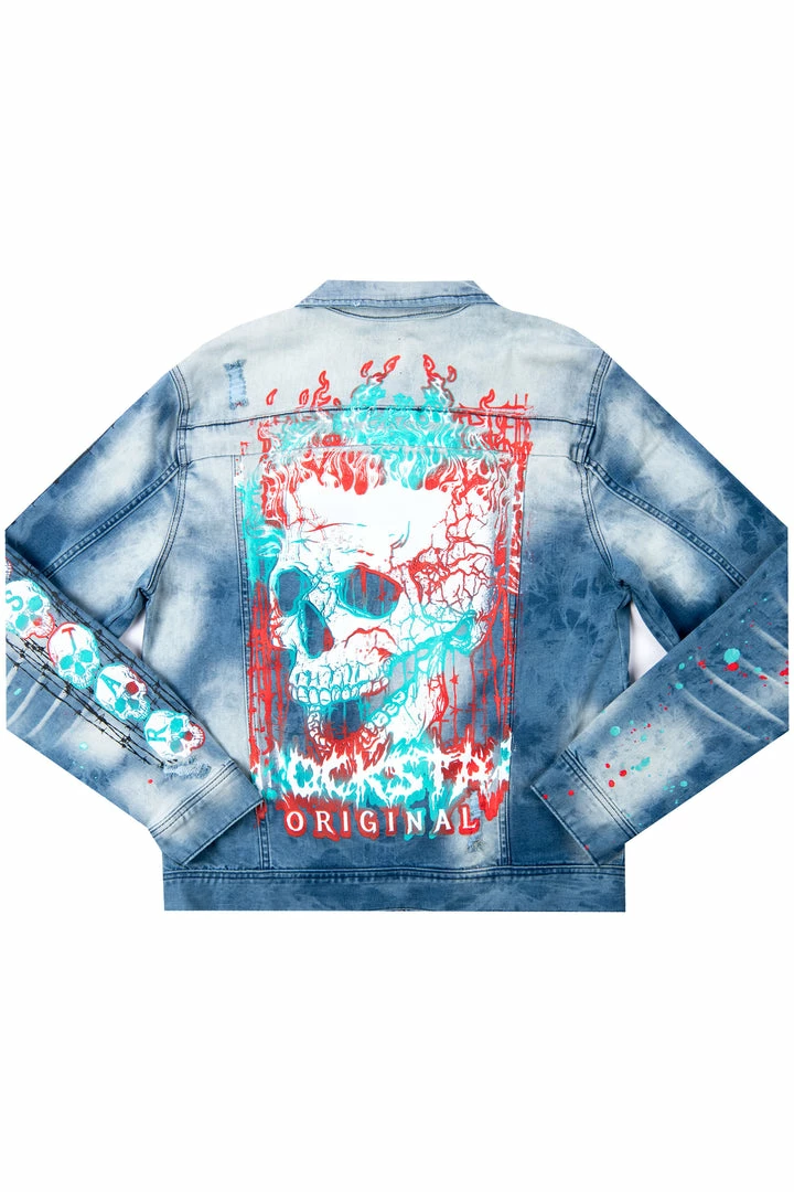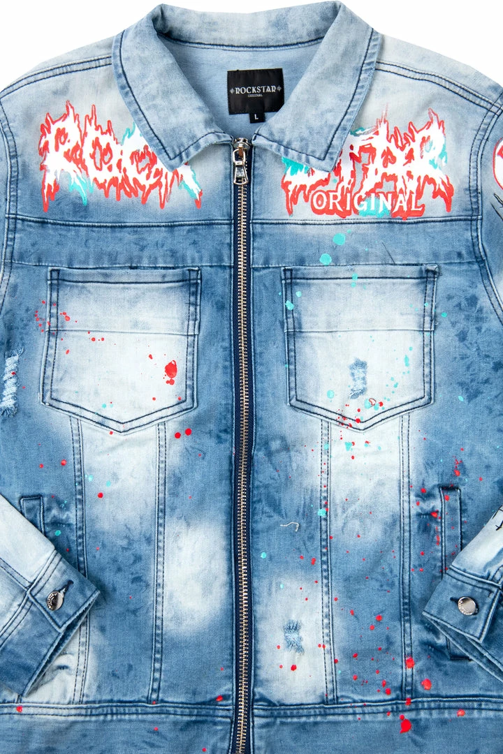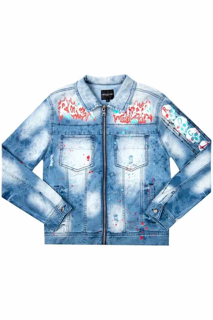 Rockstar Original men’s denim jacket featuring assorted graphic prints with RSO logo. Distressed details all throughout with high quality zipper down closure.