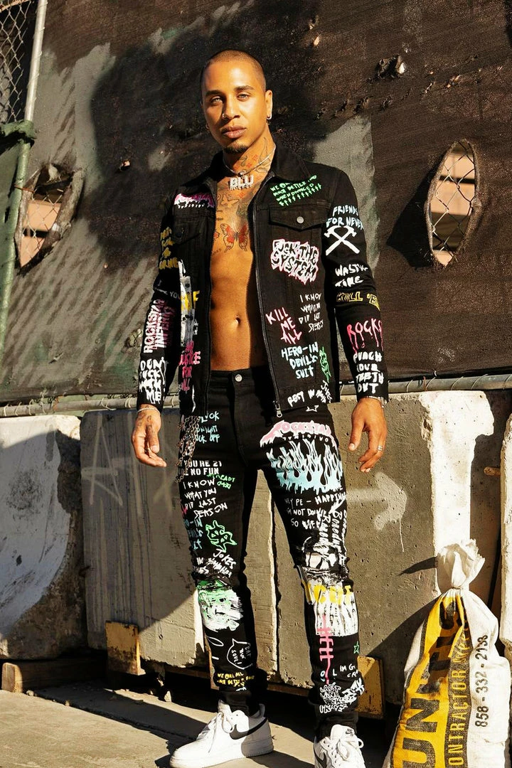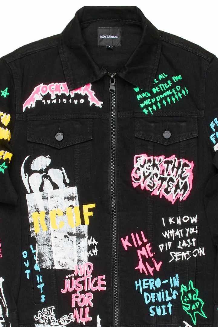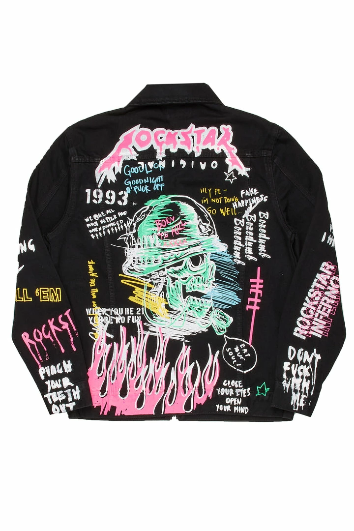 Rockstar Original Men’s denim jacket in black. Featuring custom painted RSO logos with graphics to match throughout. This unique must-cop denim jacket accents a collared neckline with a high quality front zipper closure, dual chest pockets and premium cotton threading for all day comfort.