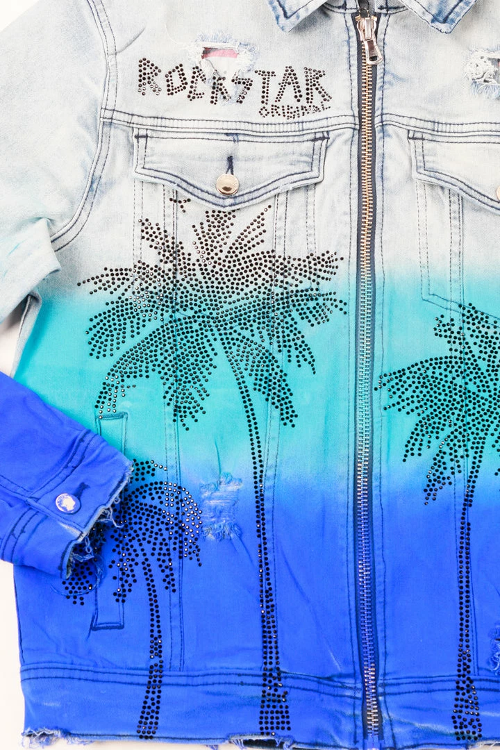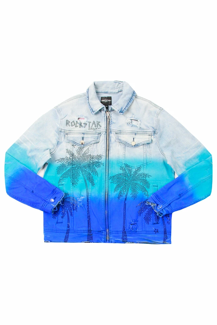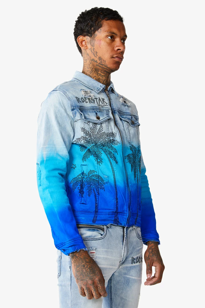 Rockstar Original men’s jacket featuring a crystal designed palm tree and RSO logo. Two tone ombre colors. Zipper down closure with two chest pockets.