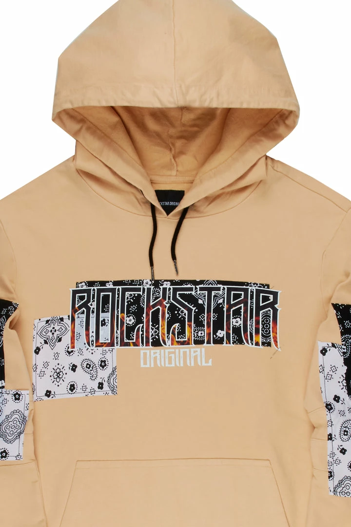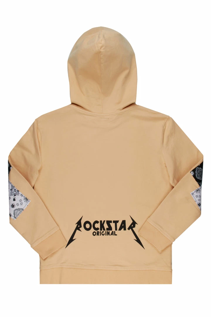 Rockstar Original Men’s hoodie in tan. Featuring graphic printed RSO logos on the front and back with embroidered paisley patches throughout β front logo features a flame design. Accenting a drawstring hood with a front pocket, cuffed hems and premium cotton threading for style and comfort.
