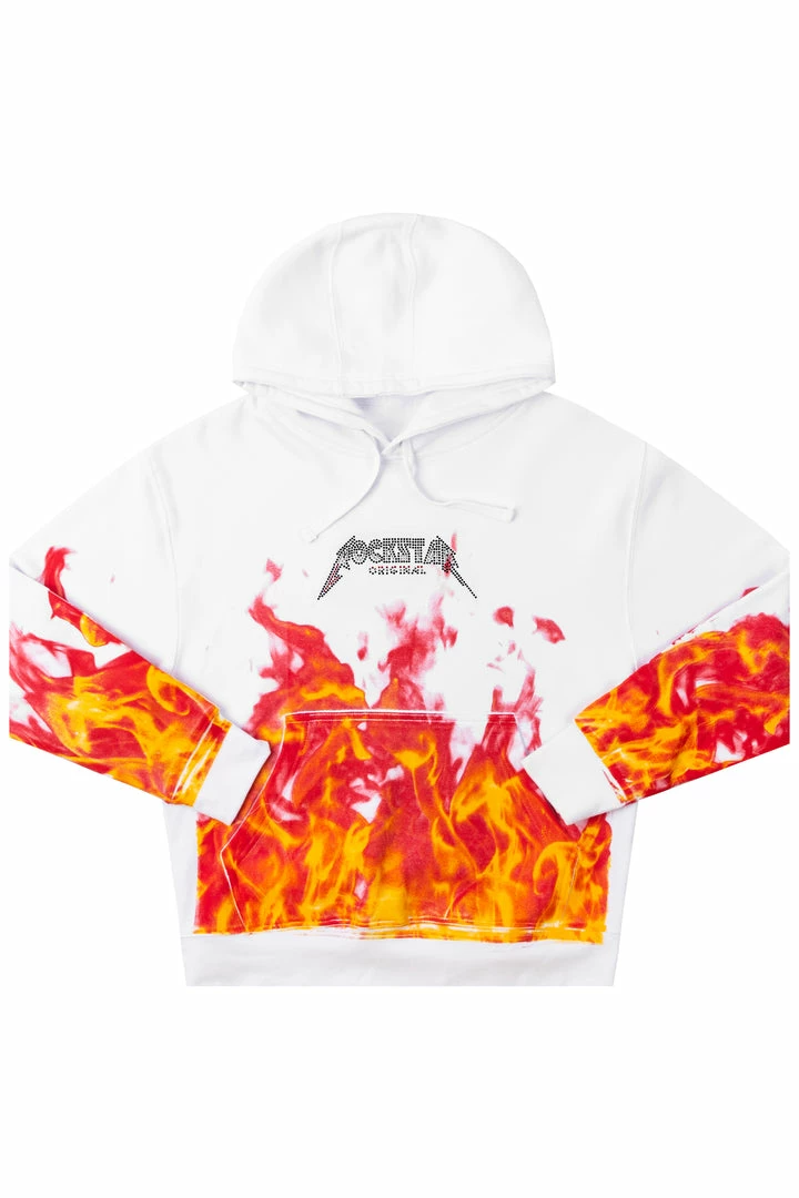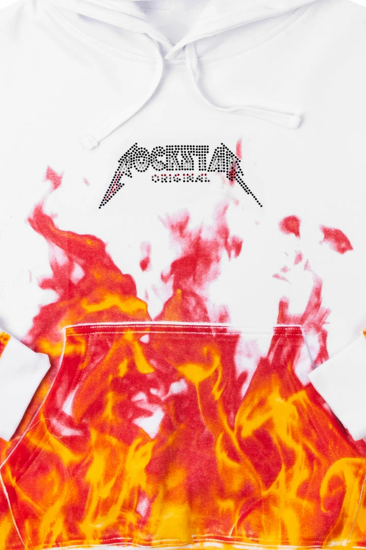 Rockstar Original men’s hoodie featuring a crystal designed with a graphic printed flame details all throughout. Front pockets with drawstring hoodie.ย