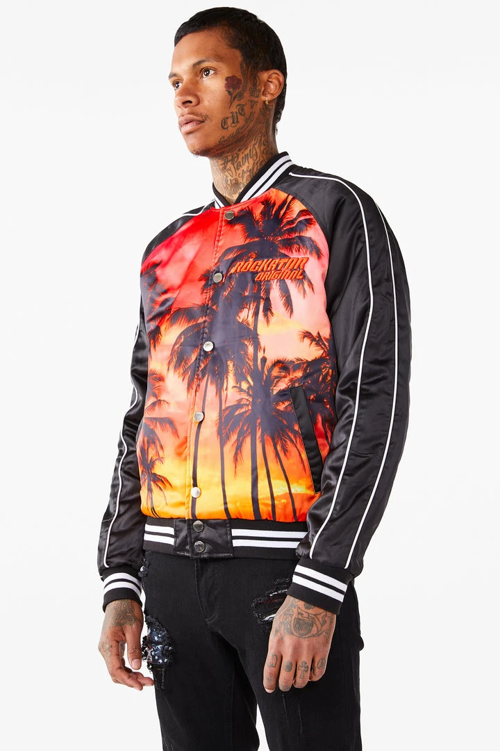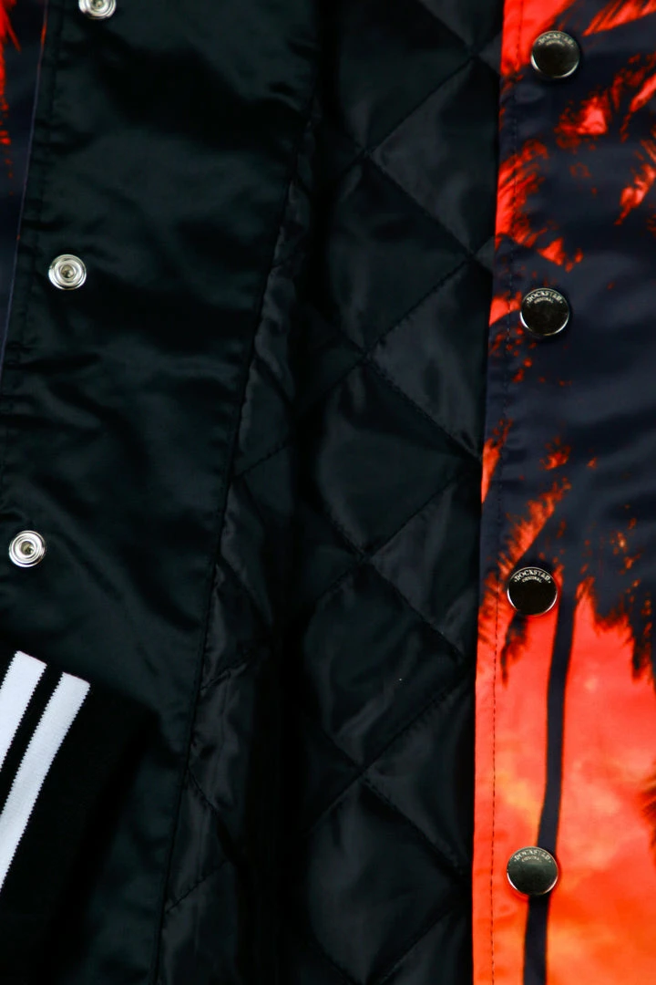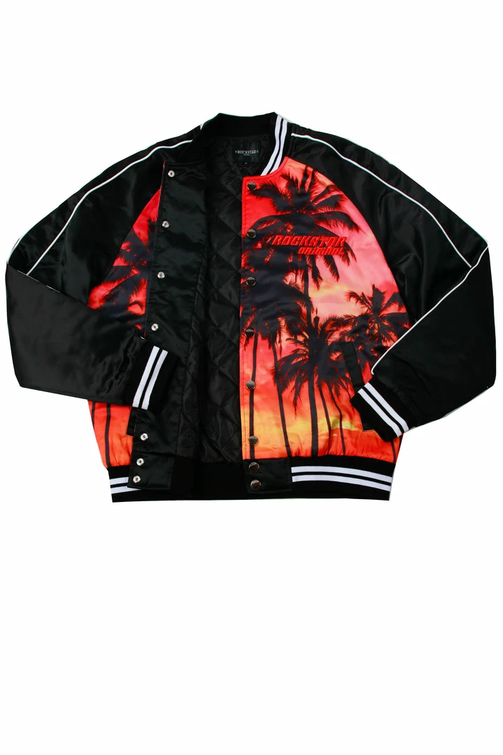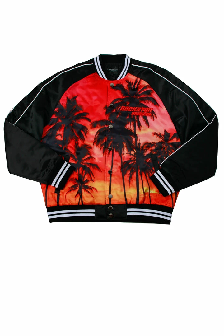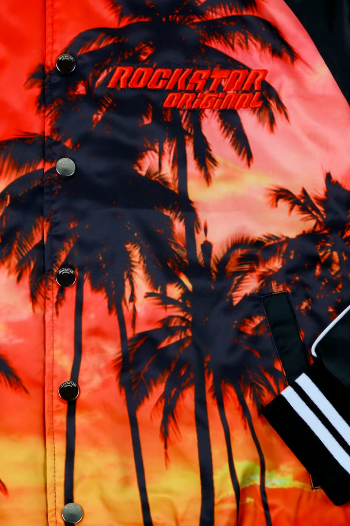 Rockstar Original men’s jacket features a palm tree graphic prints all throughout with stripe details. Bomber design with nylon mesh lining. High quality button down closure.