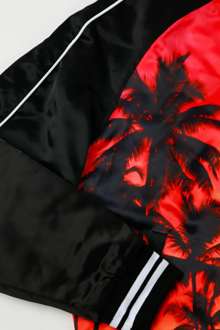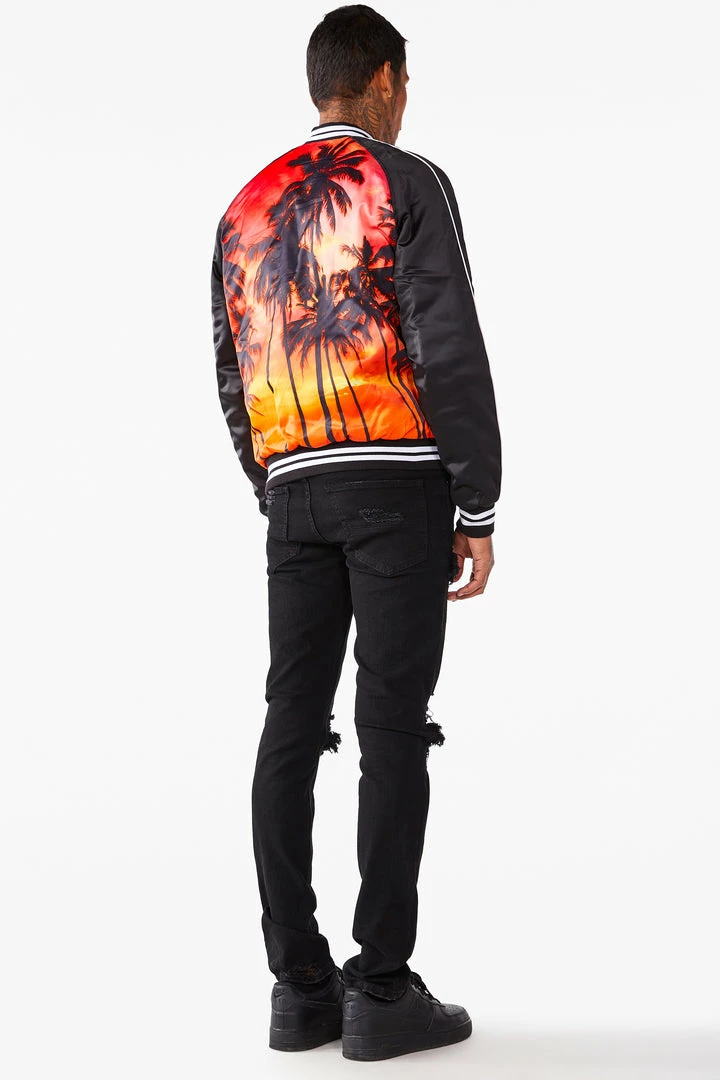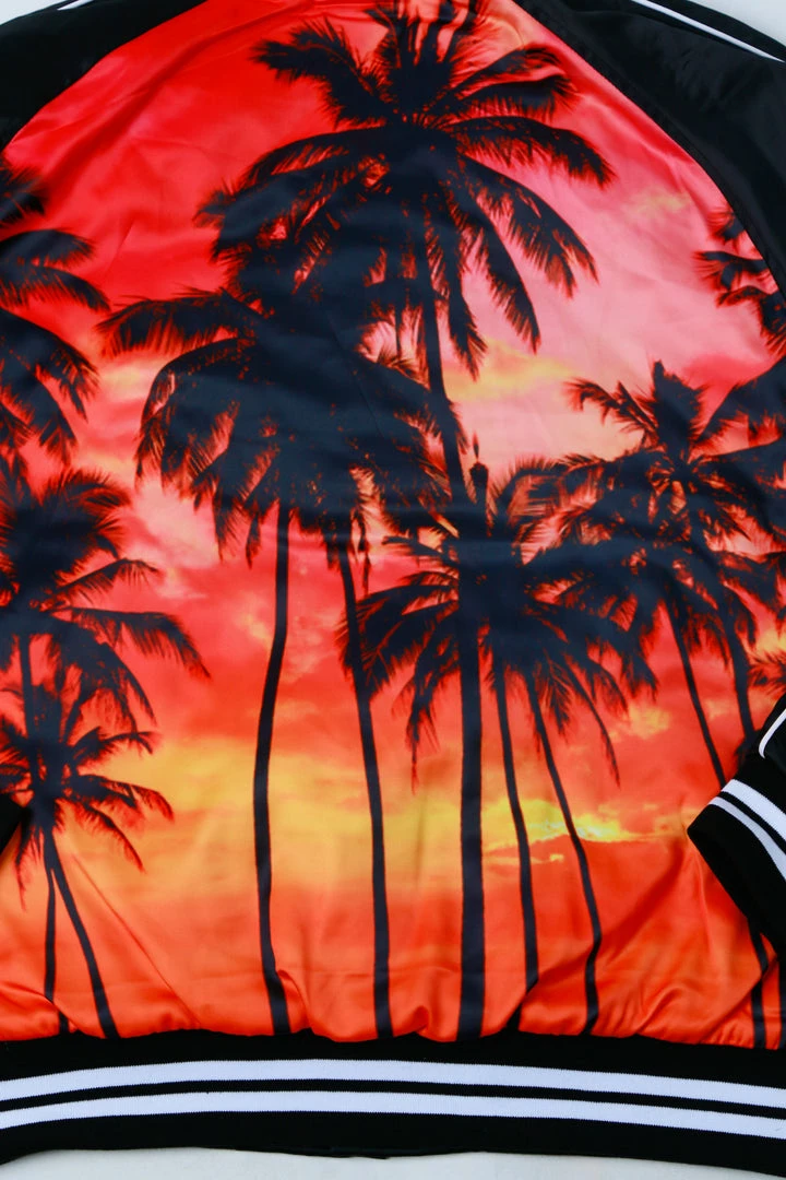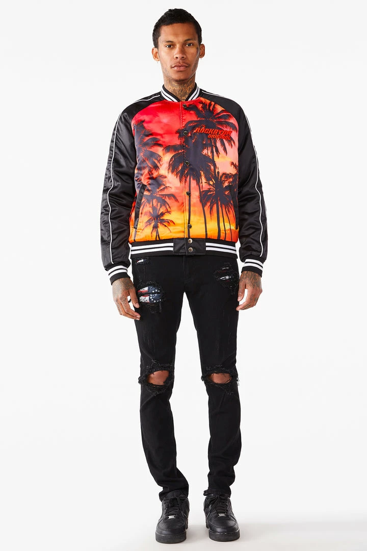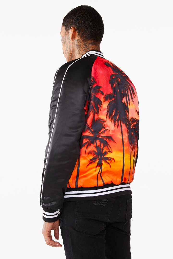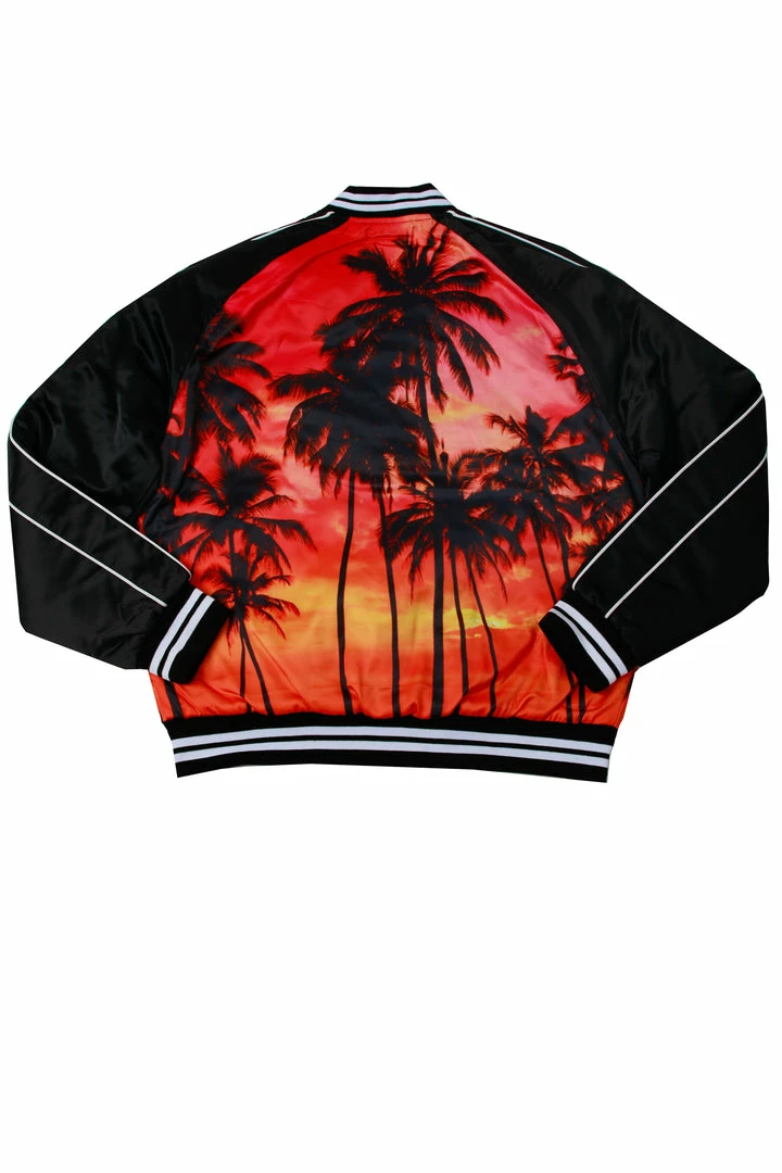 Rockstar Original men’s jacket features a palm tree graphic prints all throughout with stripe details. Bomber design with nylon mesh lining. High quality button down closure.
