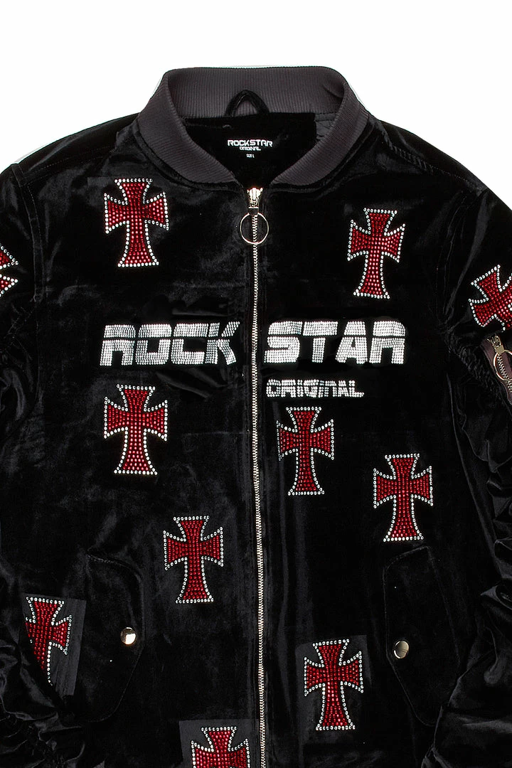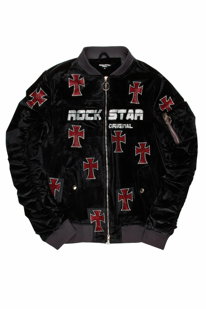 Rockstar Original Men’s velour jacket in black. Featuring a rhinestone RSO logo with rhinestone cross graphics throughout. Accenting ribbed hems and ruched detailing with a high quality zipper coin pocket on the sleeve, front zipper closure, dual front button pockets and premium polyester inner lining for all day comfort.