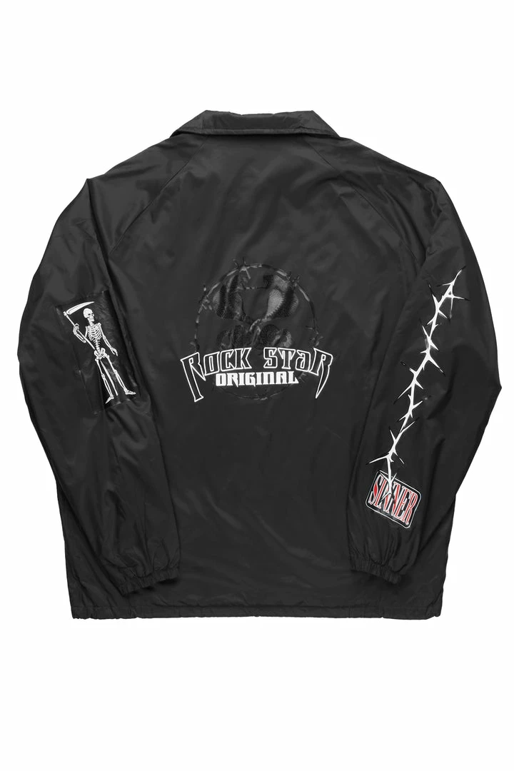 Rockstar Original Men’s water resistant windbreaker in black. Featuring a varsity style R on the chest with a RSO logo to match and multi color printed graphics throughout. Accenting a collar neckline, front snap closure, side pockets and inner mesh lining. This jacket is designed with elastic cuffs and a fastening drawstring hem for all day comfort.