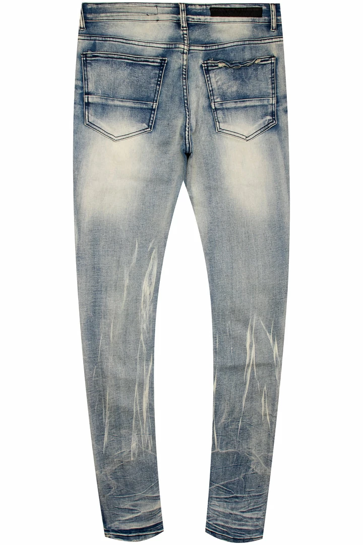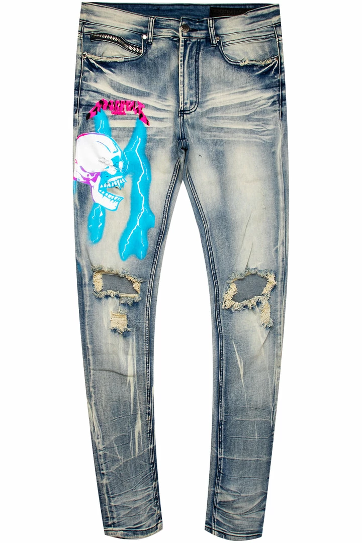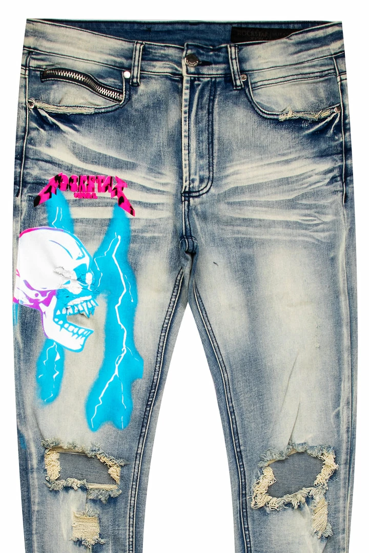 Rockstar Original Men’s denim jean in light wash. Featuring a custom painted RSO logo with graphic to match. This unique style is designed with distressed detailing and a high quality zipper coin pocket with a front button closure for a classic denim jean look with a twist!