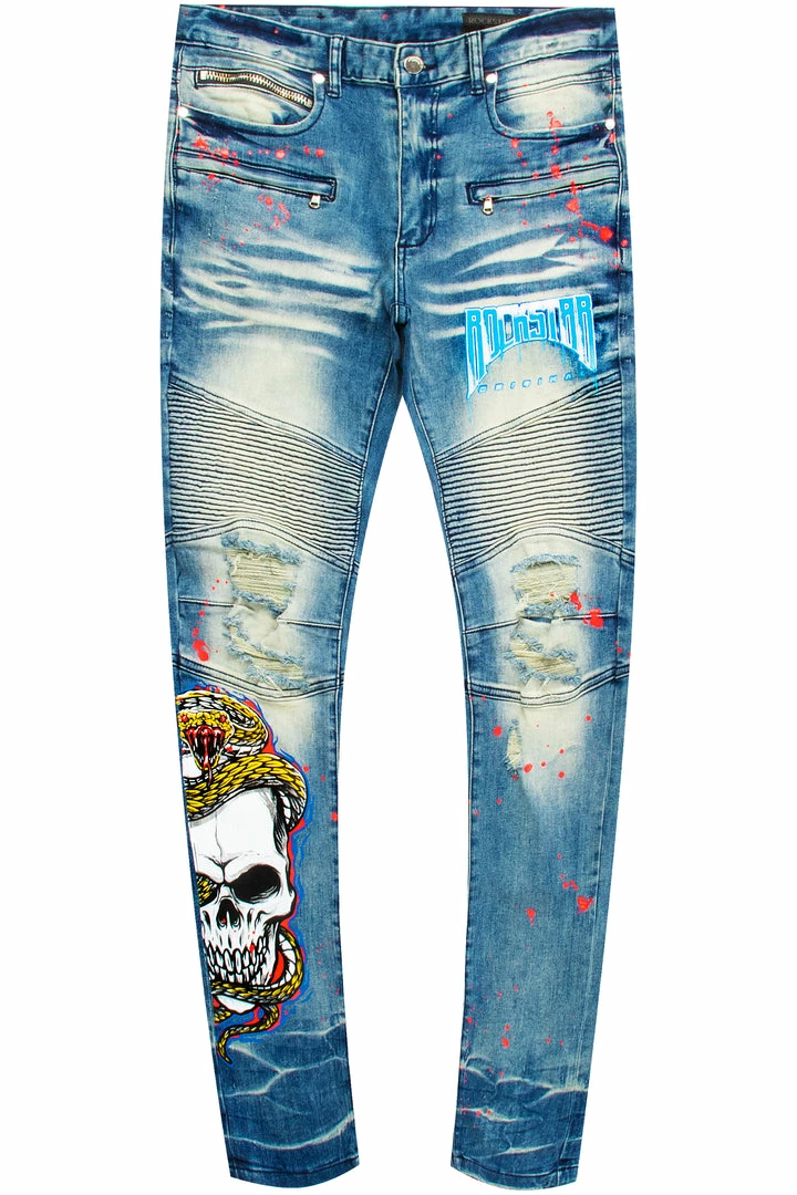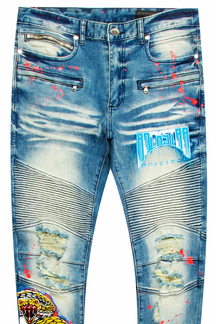Rockstar Original Men’s denim jean in light wash. Featuring a RSO logo with graphic prints, custom splatter paint and distressed styling throughout for that classic Rockstar look. This new style accents premium cotton threading and a high quality zipper coin pocket with a button closure for comfort and convenience.