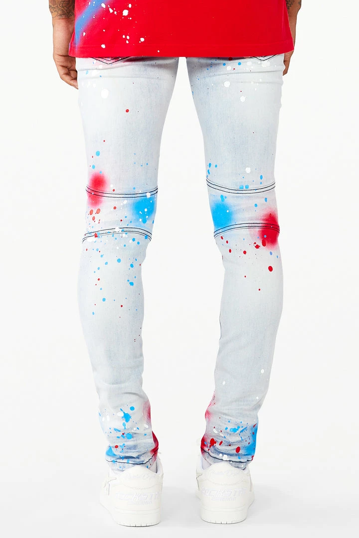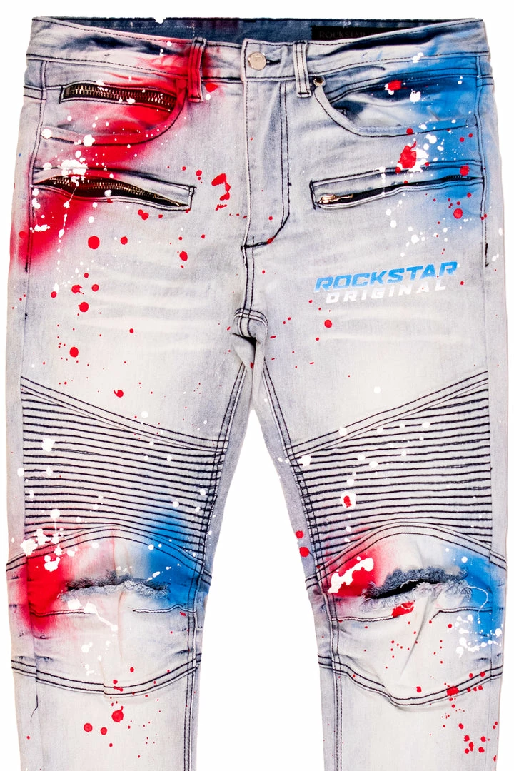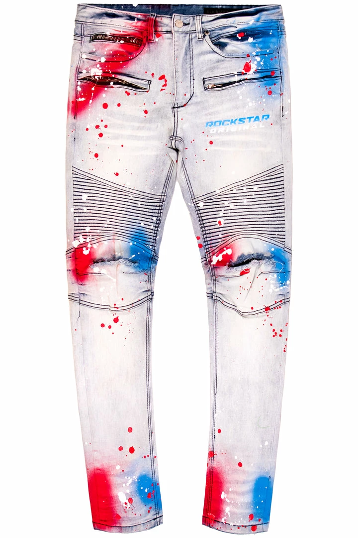Rockstar Original men’s denim featuring a paint splatter design with graffiti highlights all throughout. Distressed details and a graphic printed RSO logo with high quality zipper coin pocket.