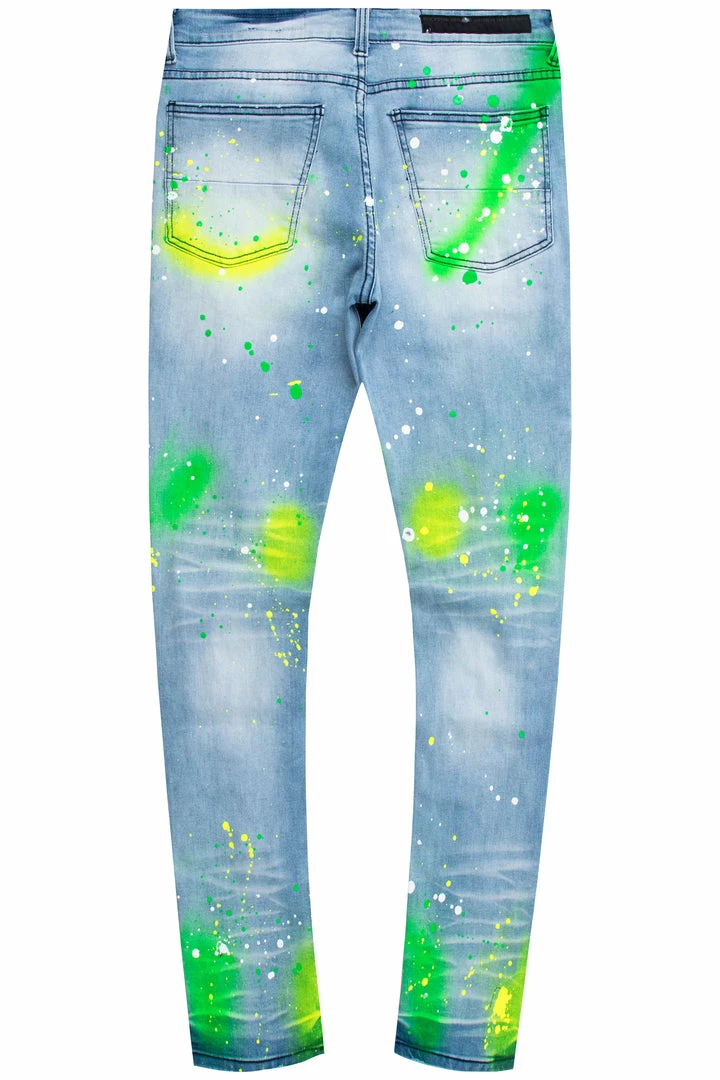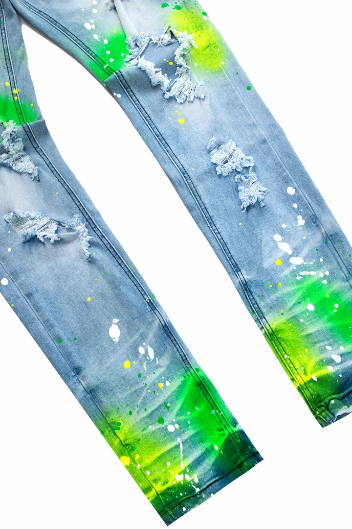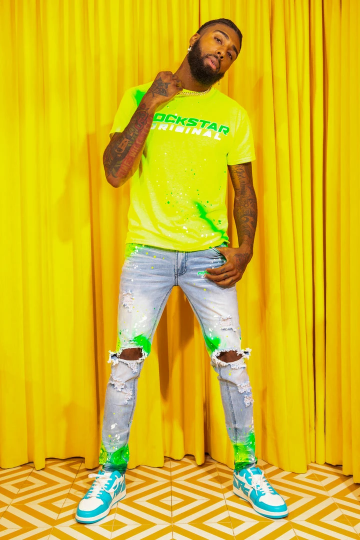 Rockstar Original men’s denim featuring a paint splatter design with graffiti highlights all throughout. Distressed details and a graphic printed RSO logo with high quality zipper coin pocket.