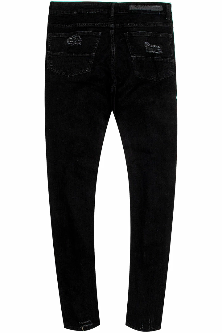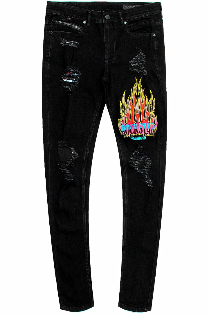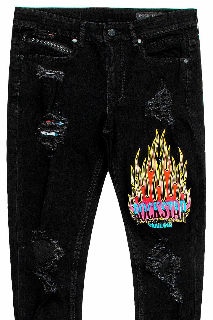 Rockstar Original Men’s denim jean in black. Featuring a graphic printed RSO logo with knee slit accents and distressed detailing throughout. This classic denim with a twist is designed with a high quality zipper coin pocket, front button closure and premium cotton threading for jeans that will move with you and for you.