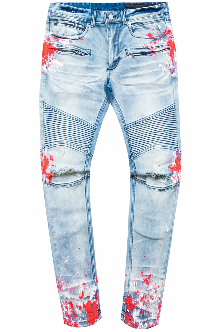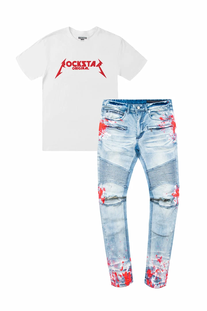 Rockstar Original Men’s Tee & Jean Bundle. Featuring two of our best-selling styles – theย Diogo Printed T-Shirt andย Kodak Biker Jean. Tee accents aย printed RSO logo, crew necklineย and relaxed fit. Jeans accent a high-quality front button closure with a zipper coin pocket,ย distressed detailing and custom paint splatterย inย aย light wash.ย