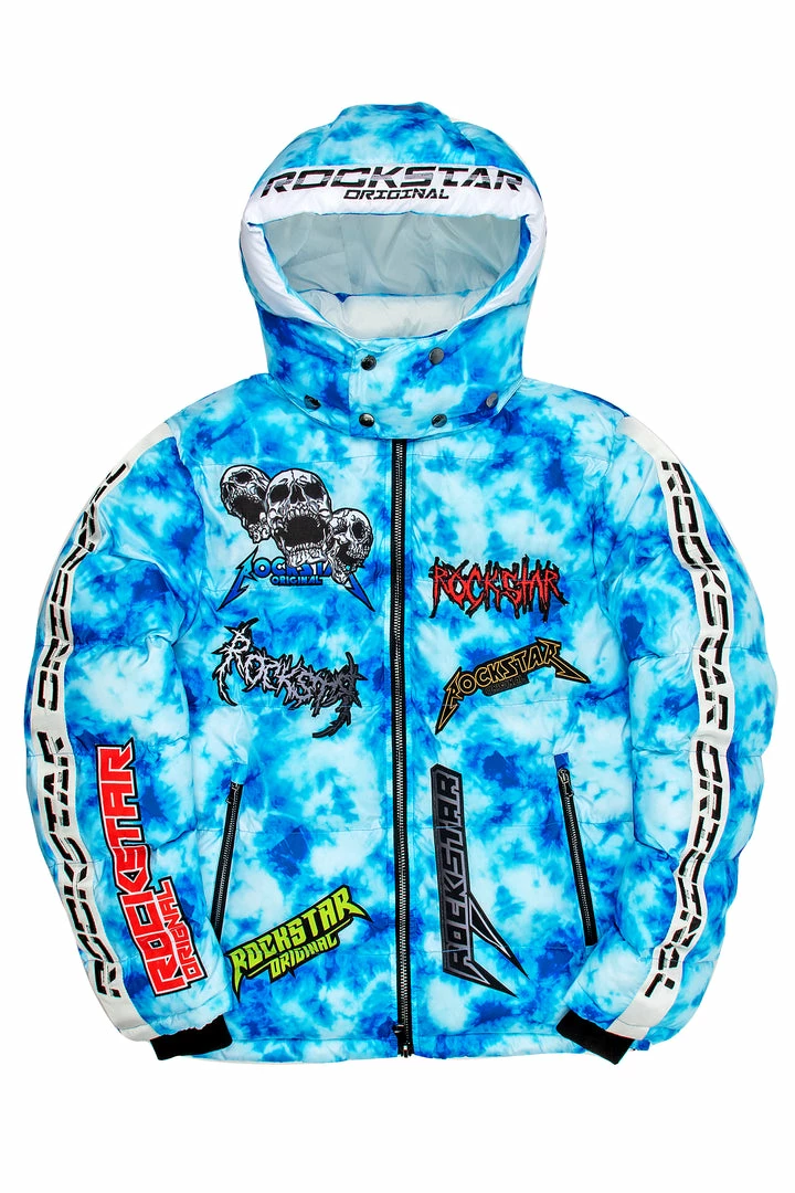 Rockstar Original Men’s puffer jacket in marble blue. Featuring embroidered RSO logos and graphic patch designing throughout. Accenting versatile material to keep you cool, comfortable and functional. This new must-have bubble coat is styled with a removable button hood, front zipper pockets and a high quality zipper closure.
