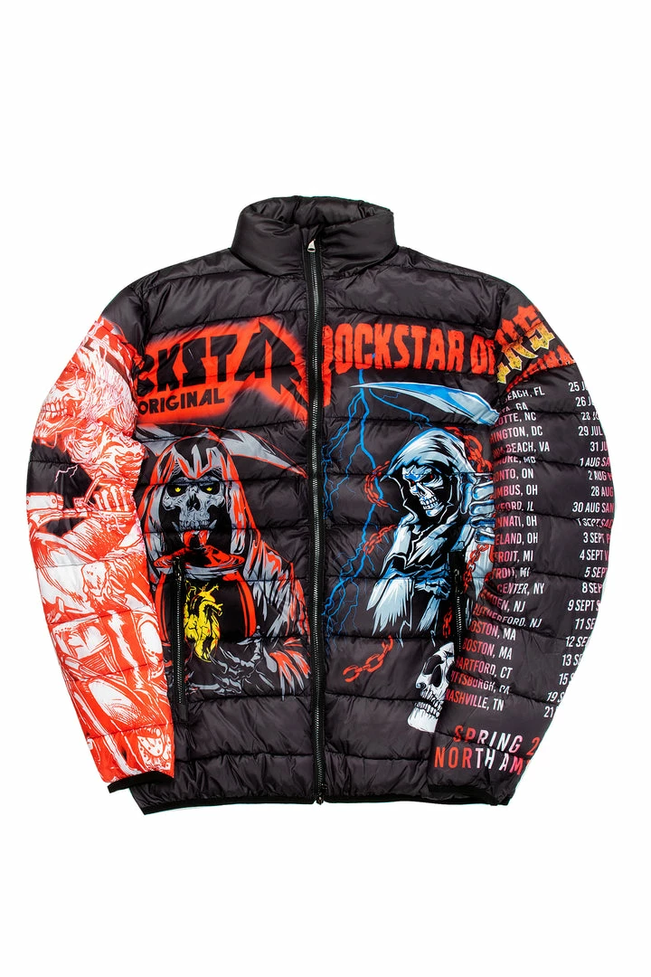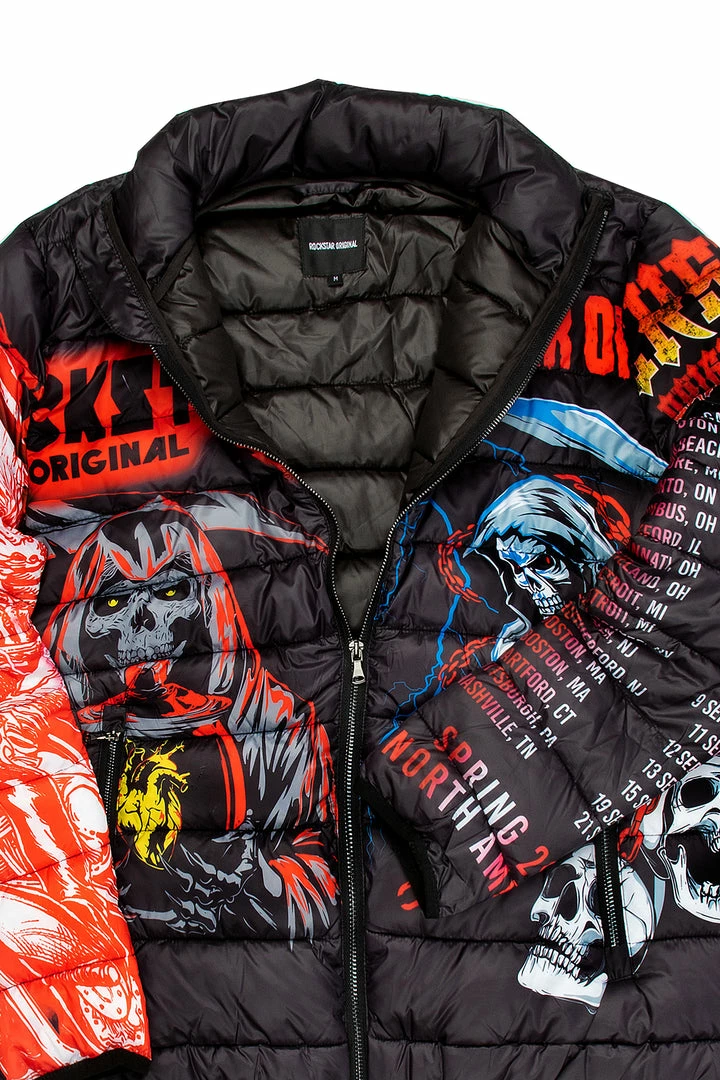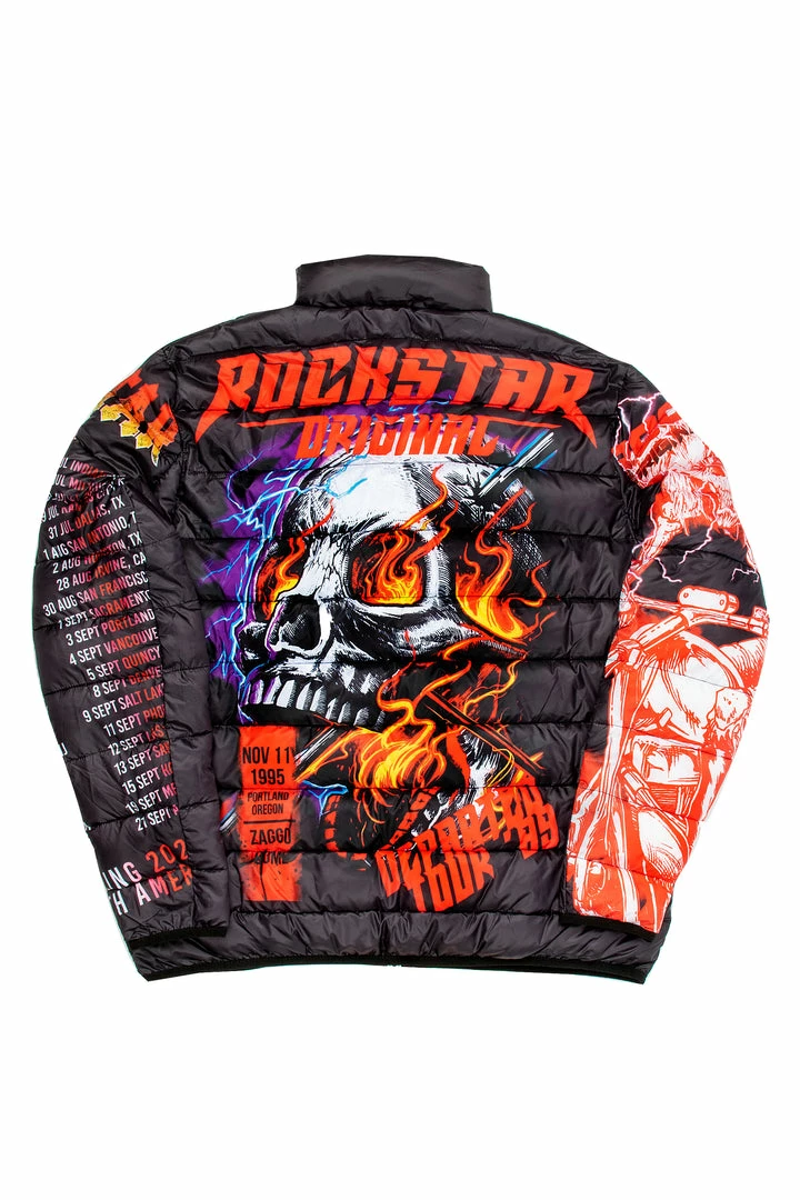 Rockstar Original Men’s puffer jacket in midnight black. Featuring printed RSO logos with bold graphics throughout to match.ย Accenting versatile material to keep you cool, comfortable and functional. This durable and fashion-forward bubble coat is lightweight and styled withย high quality zipper pockets and a front zipper closure.ย