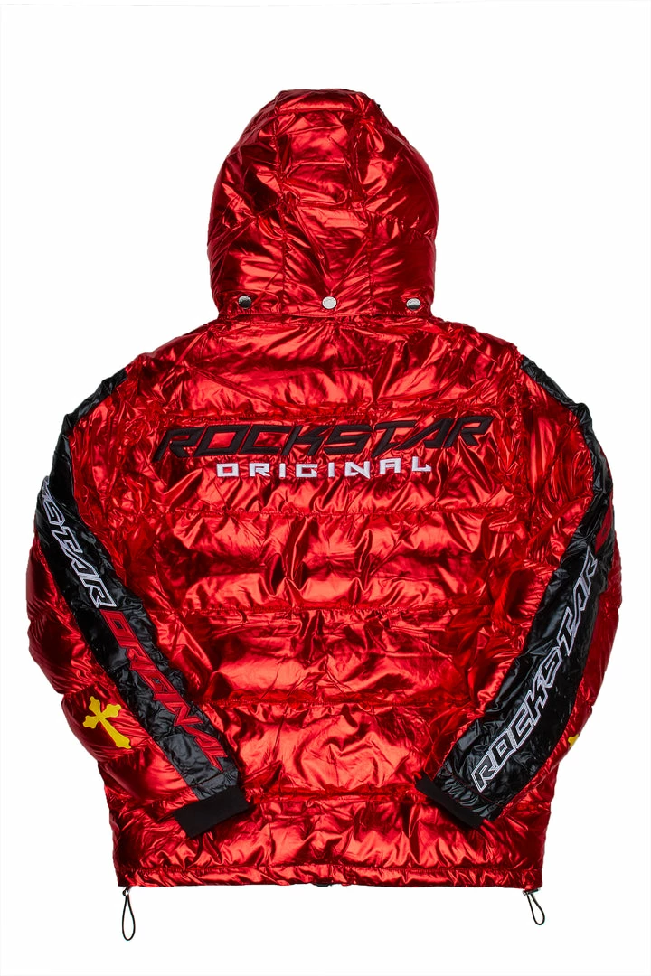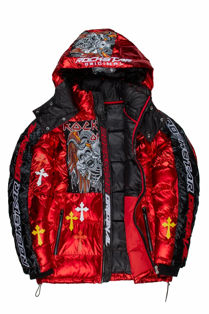 Rockstar Original Men’s puffer jacket in Rockstar red. Featuring graphic printed RSO logos, embroidered paisley patches and custom rhinestone cross graphics with a bold metallic designing throughout. Accenting versatile material to keep you cool, comfortable and functional. This new must-have bubble coat is styled with a removable button hood, front zipper pockets and a high quality zipper closure.