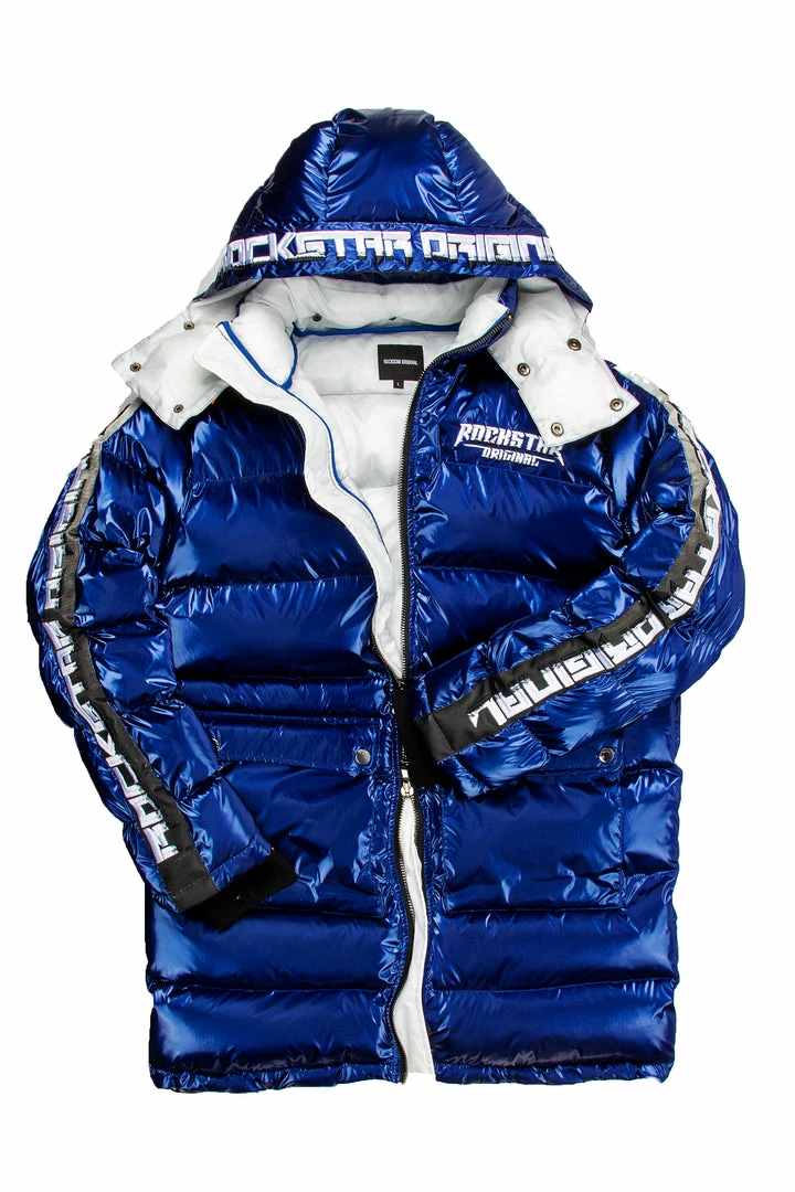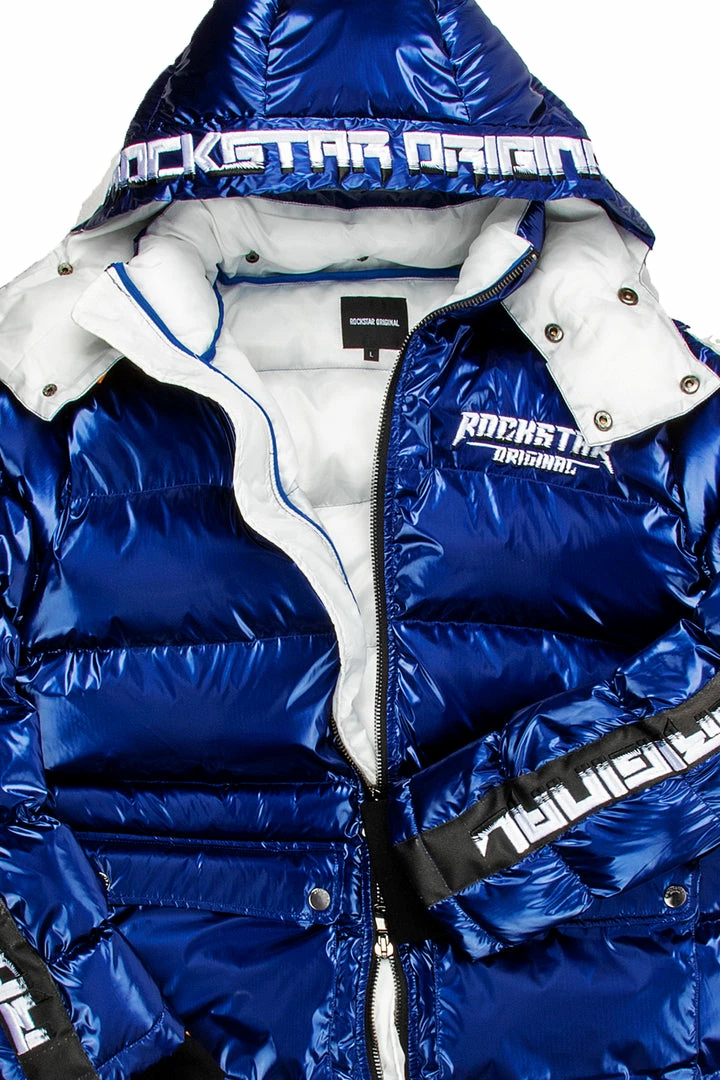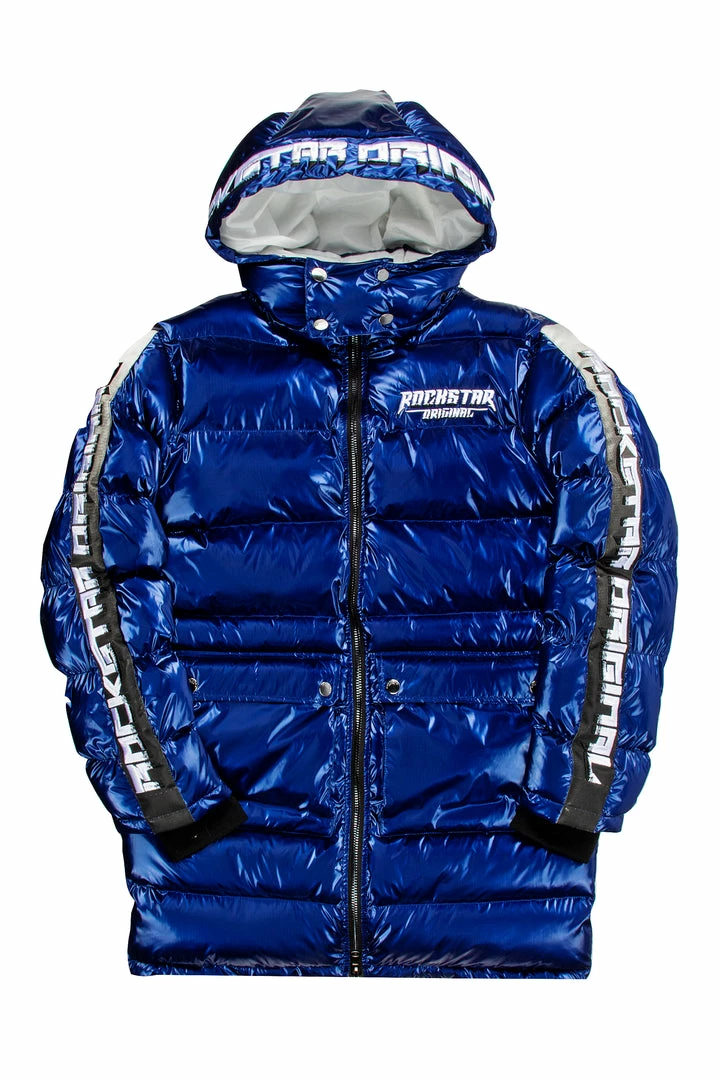 Rockstar Original Men’s mid-length puffer jacket inย brilliant blue. Featuring embroidered RSO logos and a bold metallic designing throughout.ย Accenting versatile material to keep you cool, comfortable and functional. Thisย newย must-have bubble coat is styled with a removable button hood, front button pocketsย and aย high quality zipper closure.ย