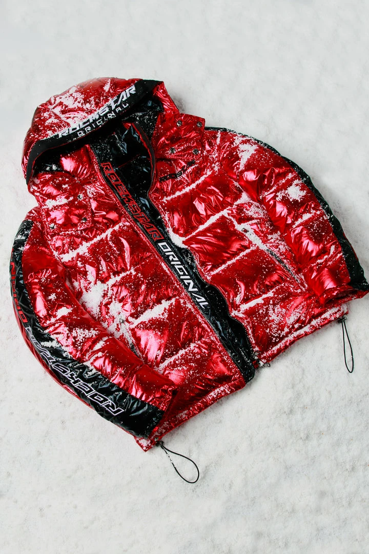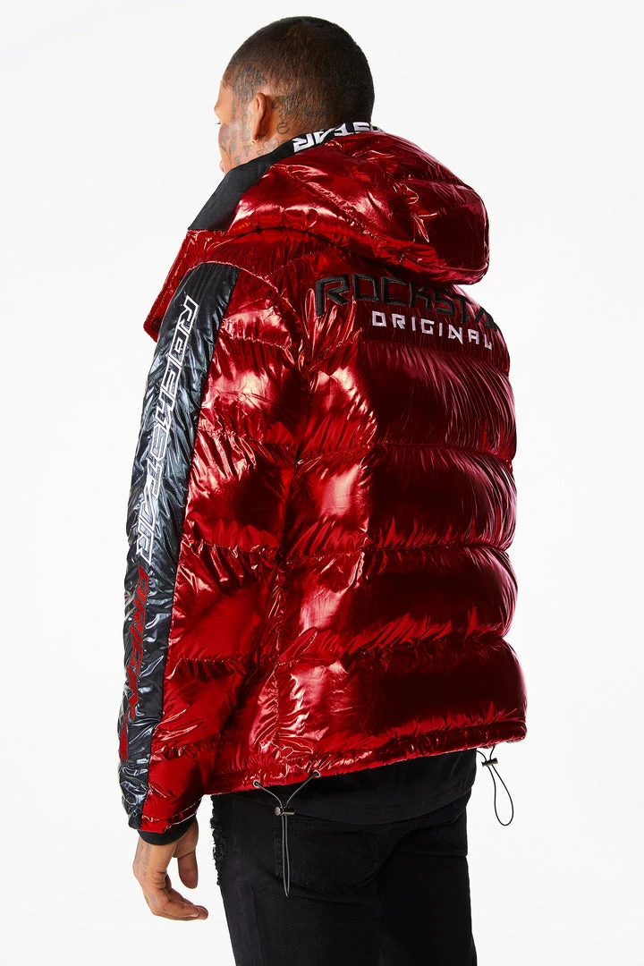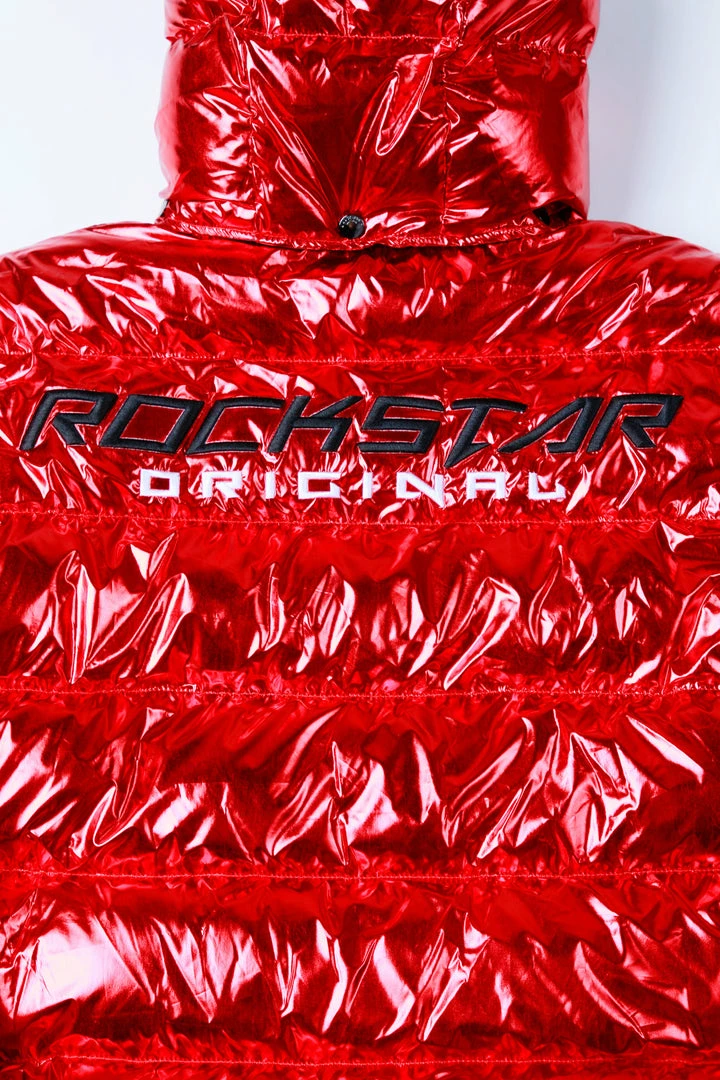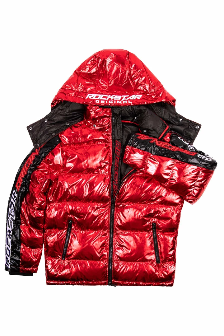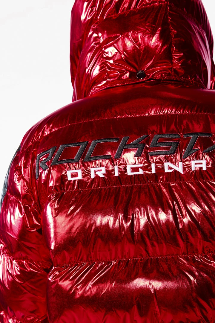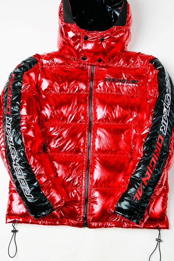 Rockstar Original Men’s puffer jacket in Rockstar red. Featuring embroidered RSO logos andย bold metallicย designing throughout.ย Accenting versatile material to keep you cool, comfortable and functional. Thisย newย must-have bubble coatย is styled with a removable button hood, front zipper pocketsย and aย high quality zipper closure.ย
