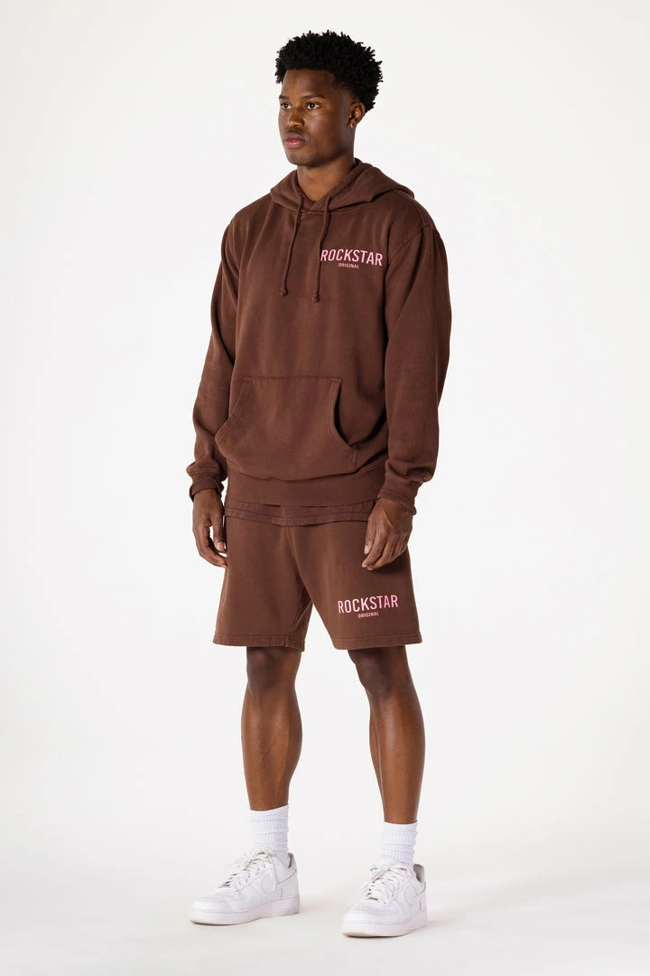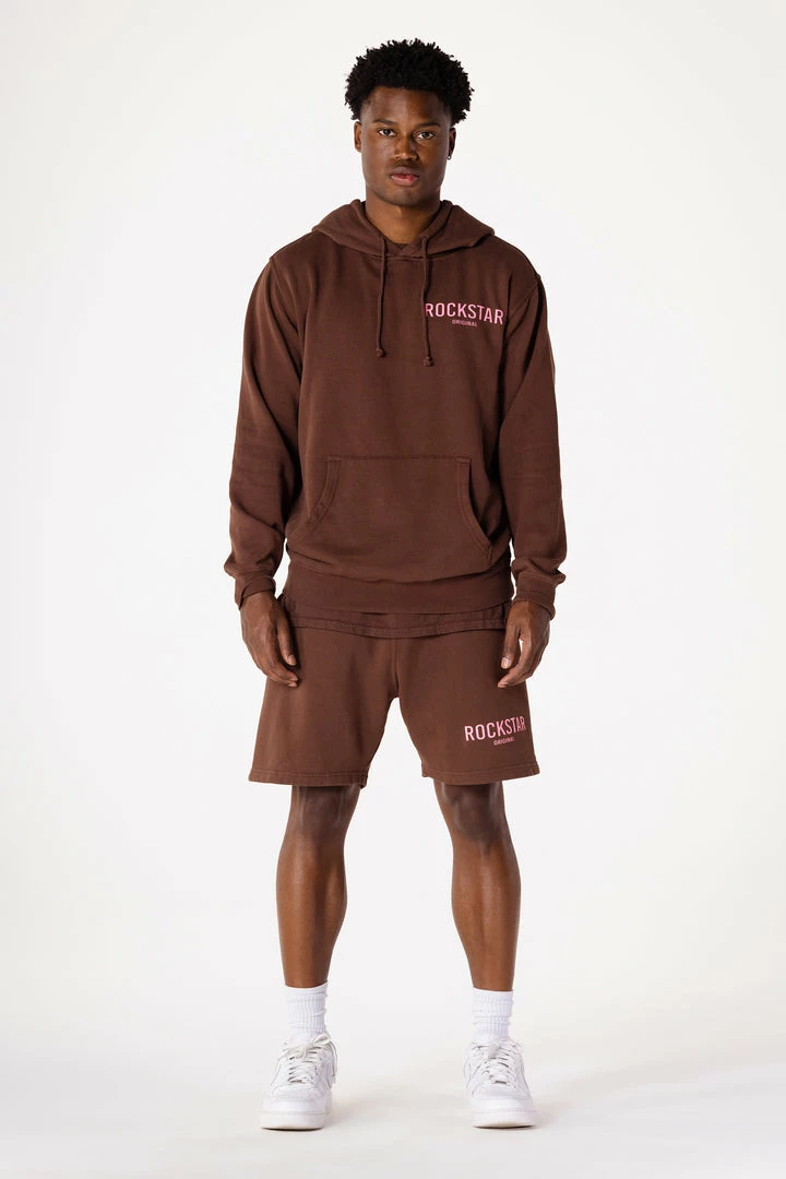 Rockstar Original Men’s two-piece essential short set in brown. Featuring clean RSO logos on the top and bottom. Top accents a drawstring hood and ribbed cuffs and hemline while bottoms accent a drawstring waistband, side pockets and ribbed cuffs. Designed with luxurious cotton for a super soft internal finish.