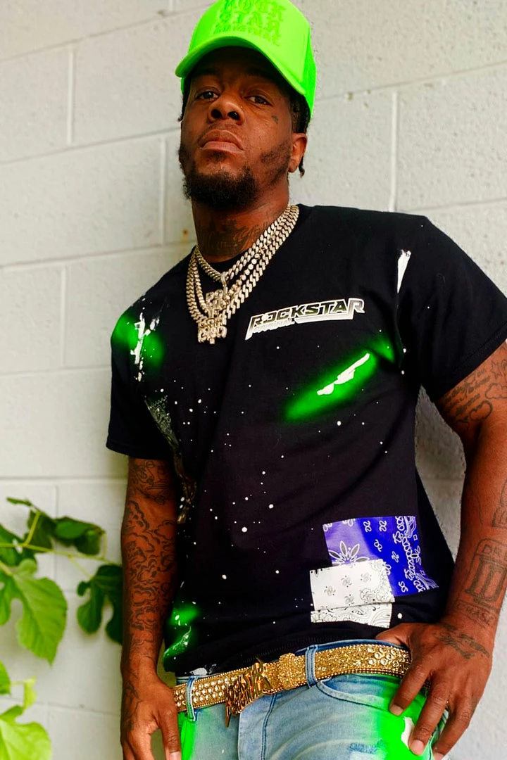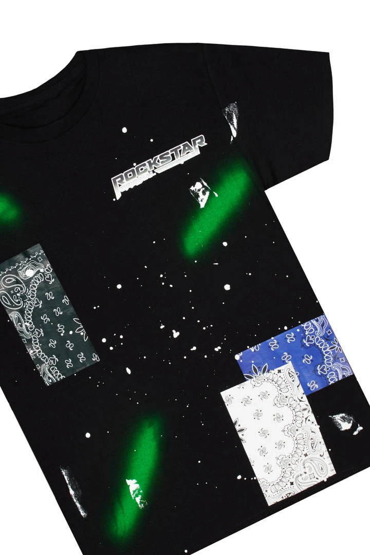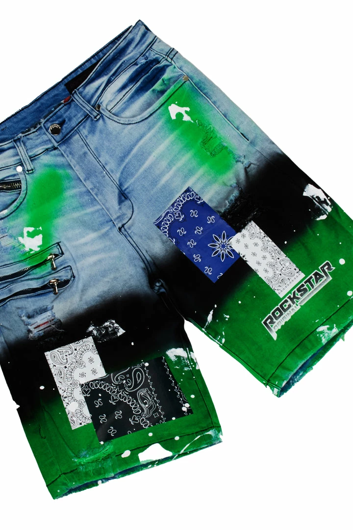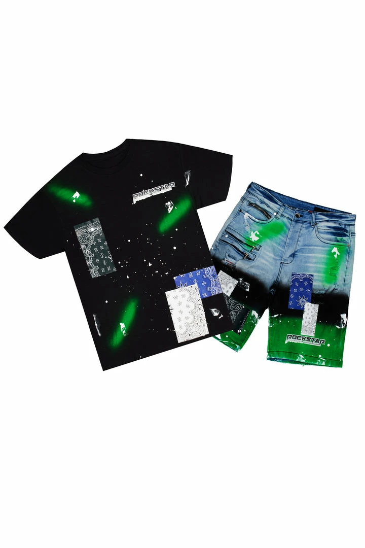 Rockstar Original Men’s denim short set in black and green. Featuring a crewneck tee and denim shorts in light wash with printed RSO logos, paisley patches and custom splatter paint throughout. Shorts accent a high quality zipper coin pocket with a front button closure, bleached detailing, raw hems and premium cotton threading for style and comfort.