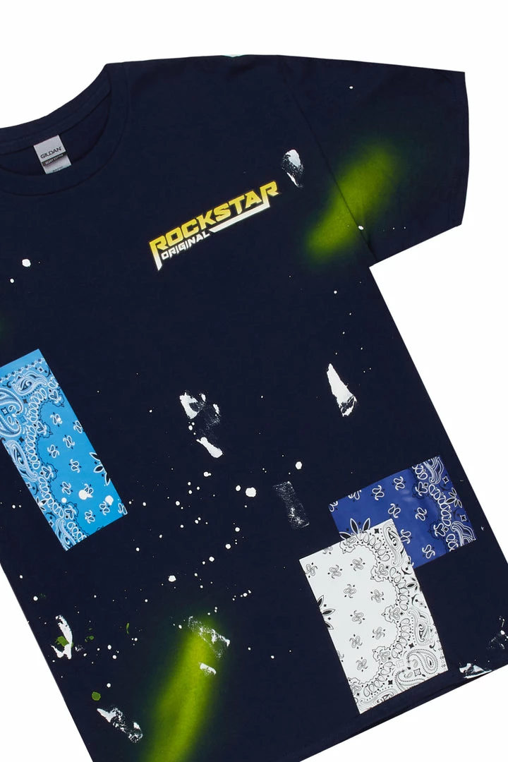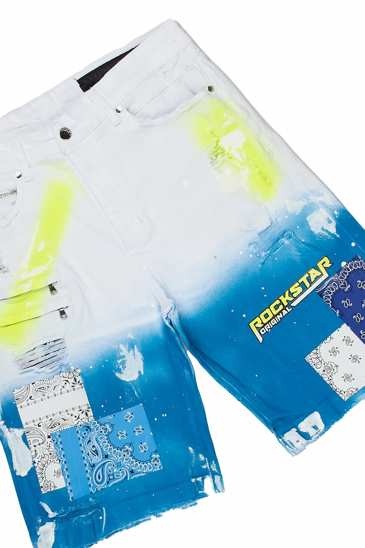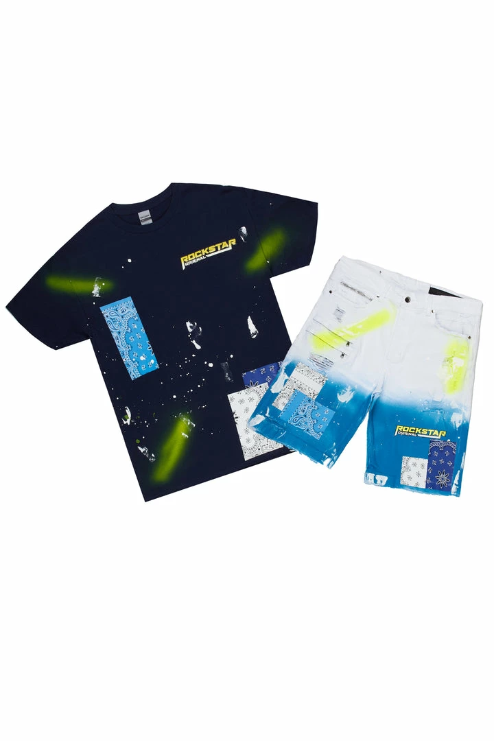 Rockstar Original Men’s denim short set inย blue and navy. Featuring a crewneck tee and denim shorts in light washย with printed RSO logos, paisley patches and custom splatter paintย throughout. Shorts accent a high quality zipper coin pocket with a front button closure, bleached detailing, raw hems and premium cotton threading for style and comfort.