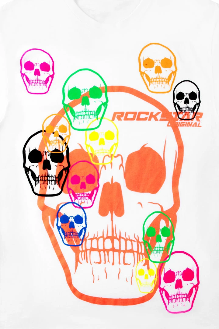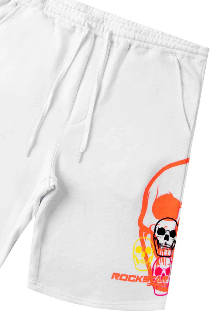 Rockstar Original men’s short tracksuit set featuring a two-piece tee and short. Tee and shorts feature’s a graphic printed RSO logo with assorted printed skulls. Drawstring waistband and front pockets.