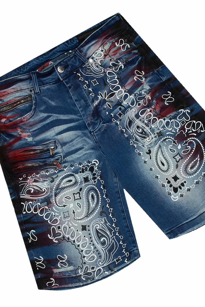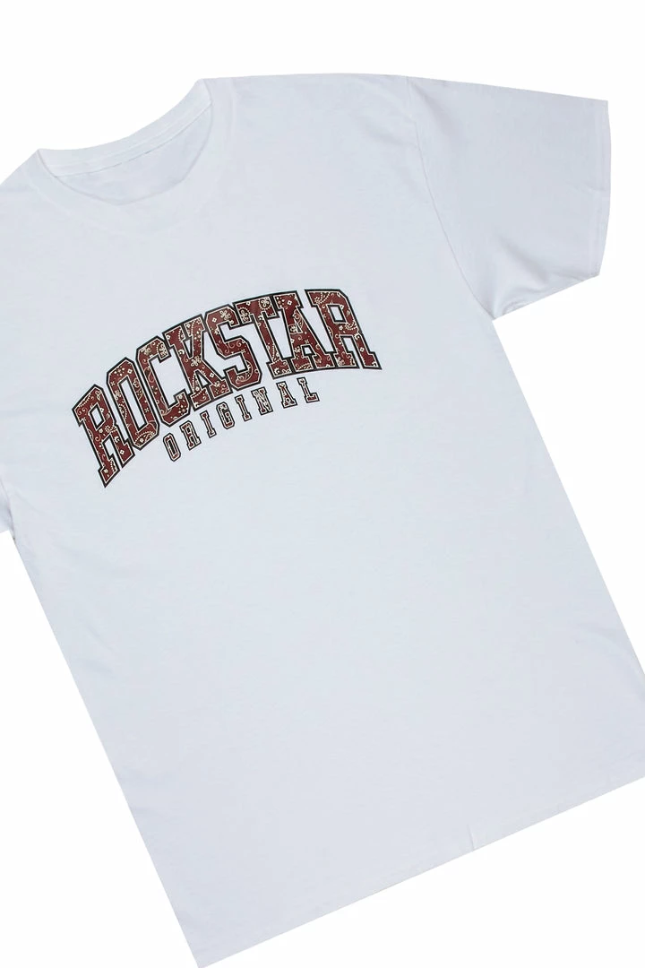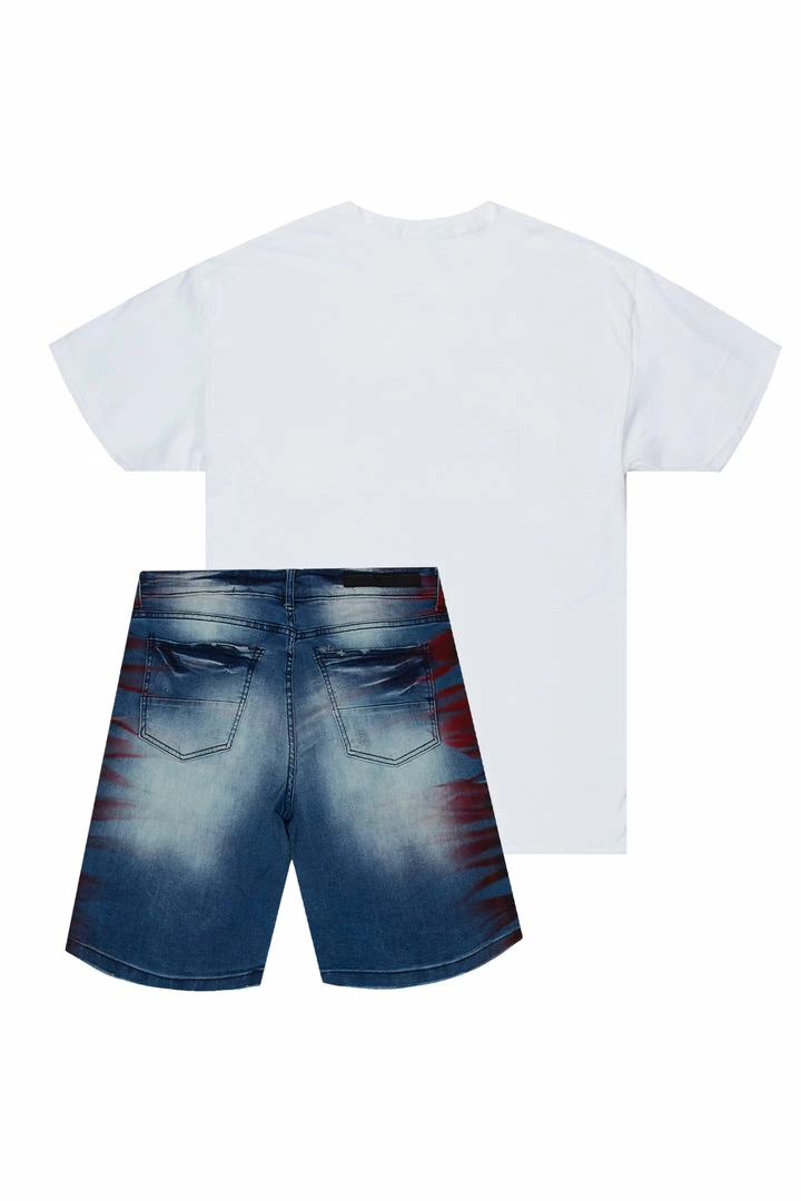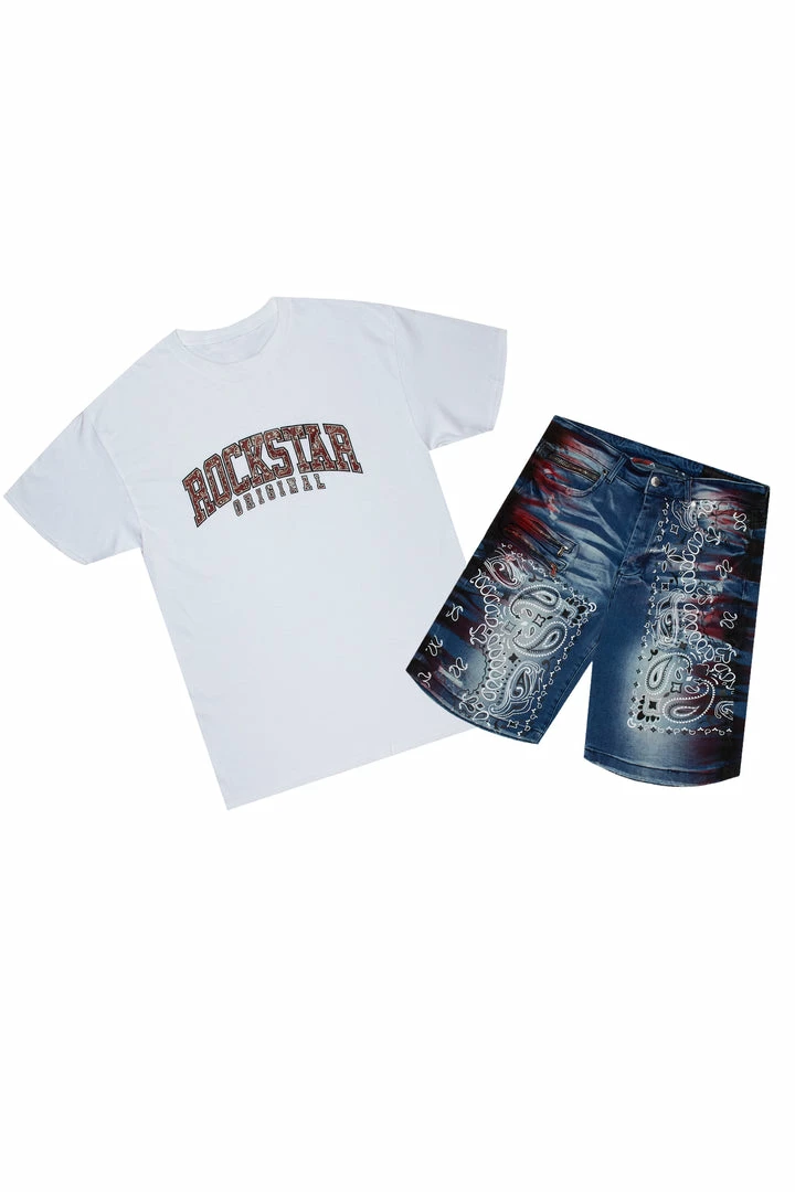 Rockstar Original Men’s denim short set. Featuring a crewneck tee and denim shorts in light wash with printed RSO logos and paisley graphics throughout. Shorts accent a high quality zipper coin pocket with a front button closure, bleached and custom paint detailing, raw hems and premium cotton threading for style and comfort.