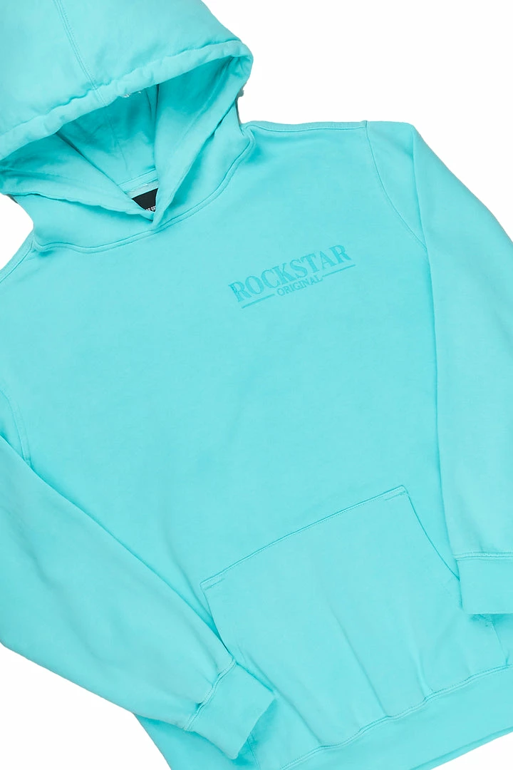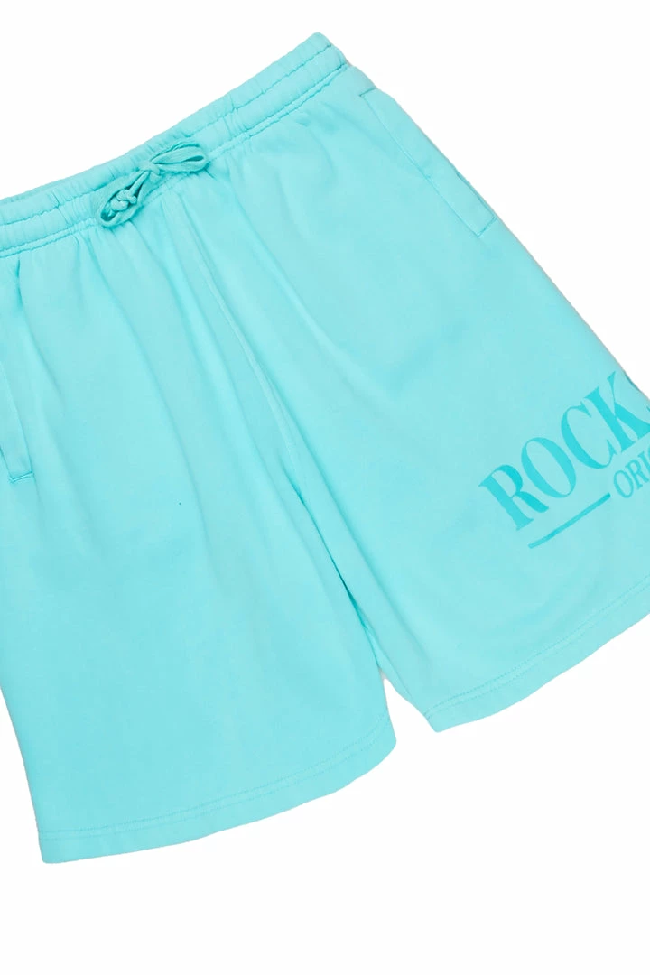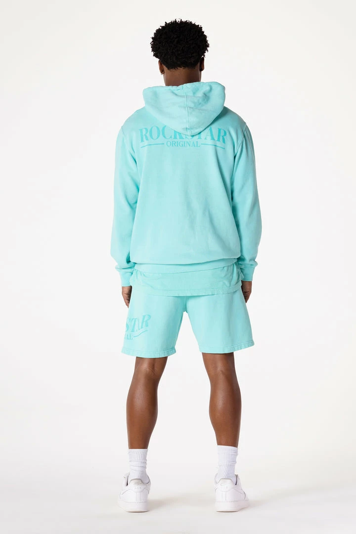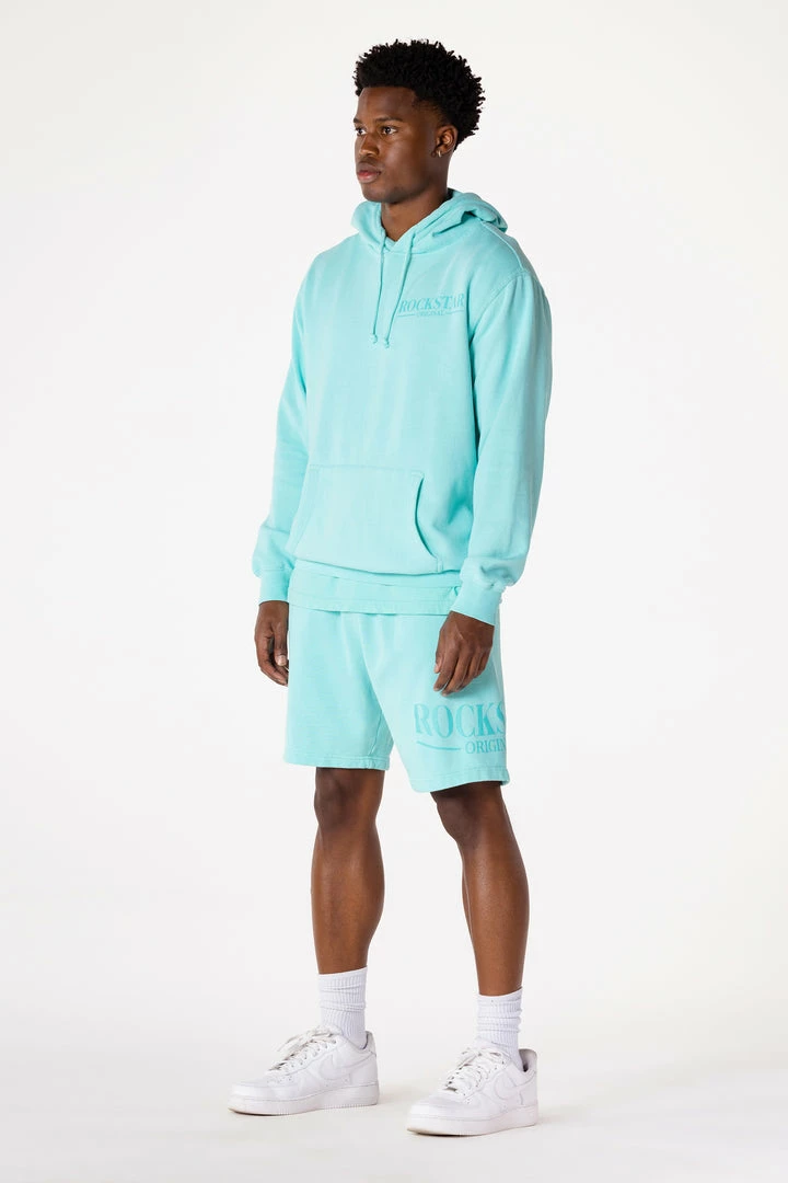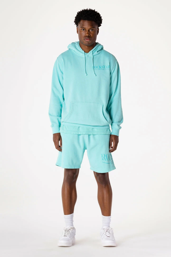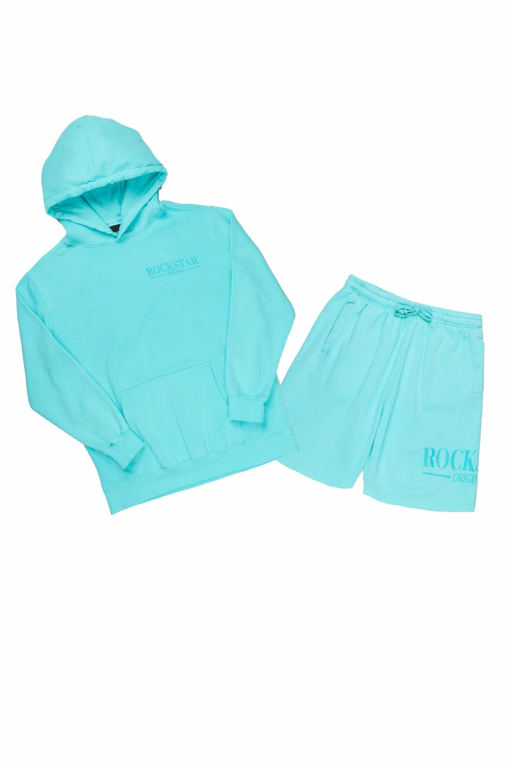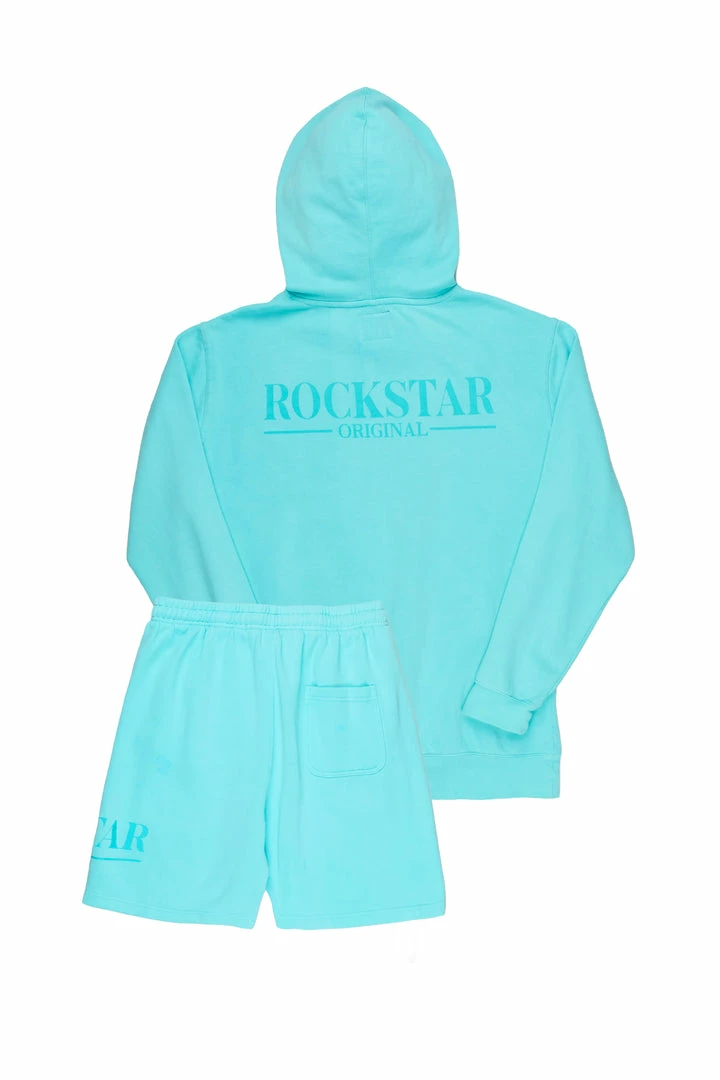 Rockstar Original Men’s two-piece essentialย shortย set inย aqua. Featuring cleanย RSO logosย on the top and bottom. Top accents aย drawstring hoodย and ribbed cuffs and hemline while bottoms accent a drawstring waistband, side pockets and ribbed cuffs. Designed with luxurious cotton for a super soft internal finish.