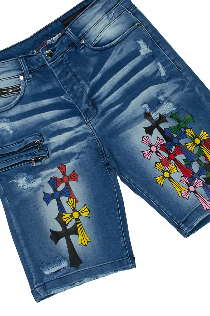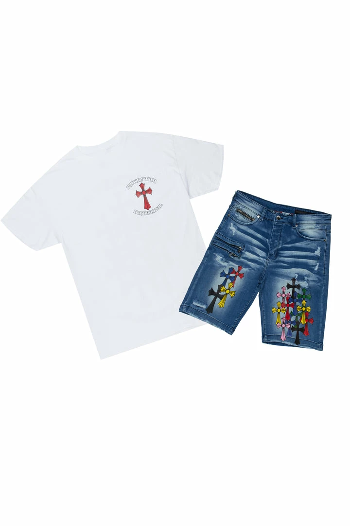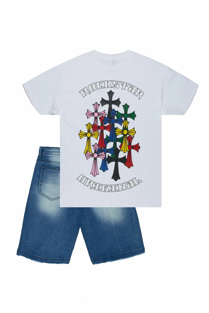 Rockstar Original Men’s denim short set in white. Featuring a crewneck tee and denim shorts in light wash with multi color printed cross graphics throughout. Shorts accent a high quality zipper coin pocket with a front button closure, bleached detailing, raw hems and premium cotton threading for style and comfort.